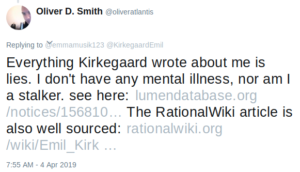 To understand the situation, one has to learn about a certain person named Oliver D. Smith, and a website called Rationalwiki (RW). RW is a snarky version of Wikipedia with looser standards of evidence (often none), and a very heavy left-wing slant. The website looks like Wikipedia, so many people think it is Wikipedia, not realizing that there are many Wiki projects on the internet. Much of the content on RW is quite decent, but the site’s leadership gives free reign to a small group of vicious individuals who basically use the website’s prominent Google position to defame people they dislike. At some point, an individual named Oliver D. Smith started using this site, and creating pages on persons he dislikes. He is quite explicit about this strategy: