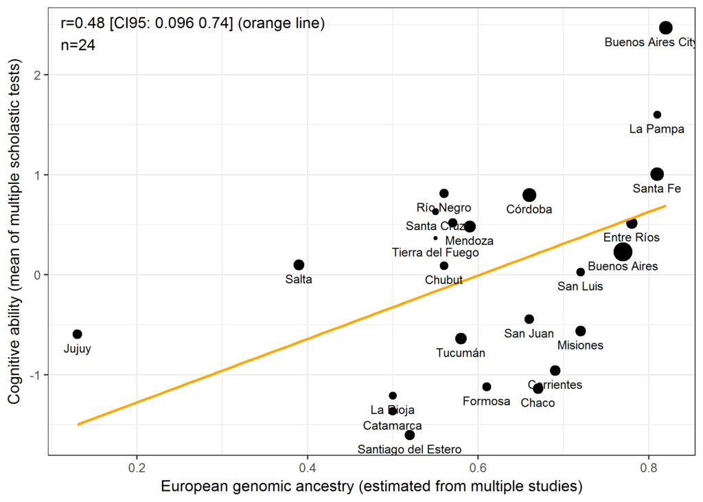 We carried out our usual thoro analysis of the predictions of genetic models of cognitive ability/social inequality with regards to admixture. We combined a variety of data sources to estimate mean racial admixture by subnational units, and related these to estimates of cognitive ability (CA) and S factor scores. In this case, we were also able to find individual-level skin tone/color data, as well as really crude cognitive ability data (2-5 items) and a decent number of social measures (>10). All in all, everything was more or less as expected: substantial correlations between European ancestry, CA and S, and some relationships to skin tone as well. The most outlying results were those for the smaller subnational units (districts, municipals) for which our estimates of European ancestry based on SIRE were not strong related to CA/S. Presumably this was due to a variety of factors including sampling error, SIRE x location interactions for predicting ancestry (as seen in Brazil), and ancestry x location interactions for predicting CA/S.