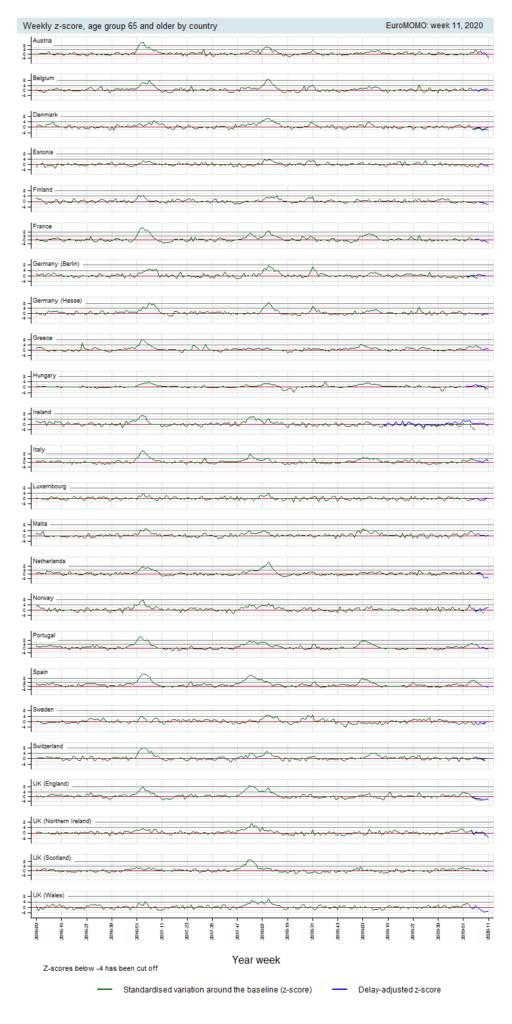 Unfortunately counting deaths is also tricky because of variation in what is included. Sick people die all the time, and some of these also get COVID, but would have died anyway. So COVID didn’t kill them, but they died and were infected at time of death, so probably would be counted in the values we see. Optimally, one would have something like a measure of marginal effect due to epidemic, i.e. additional deaths or hospitalizations in the duration of the epidemic that cannot be explained by normal variation in the last X years. Is there such data? Yeah, EuroMOMO produces these. Let’s look at the data for week 11 of 2020 (March 9 to March 15):