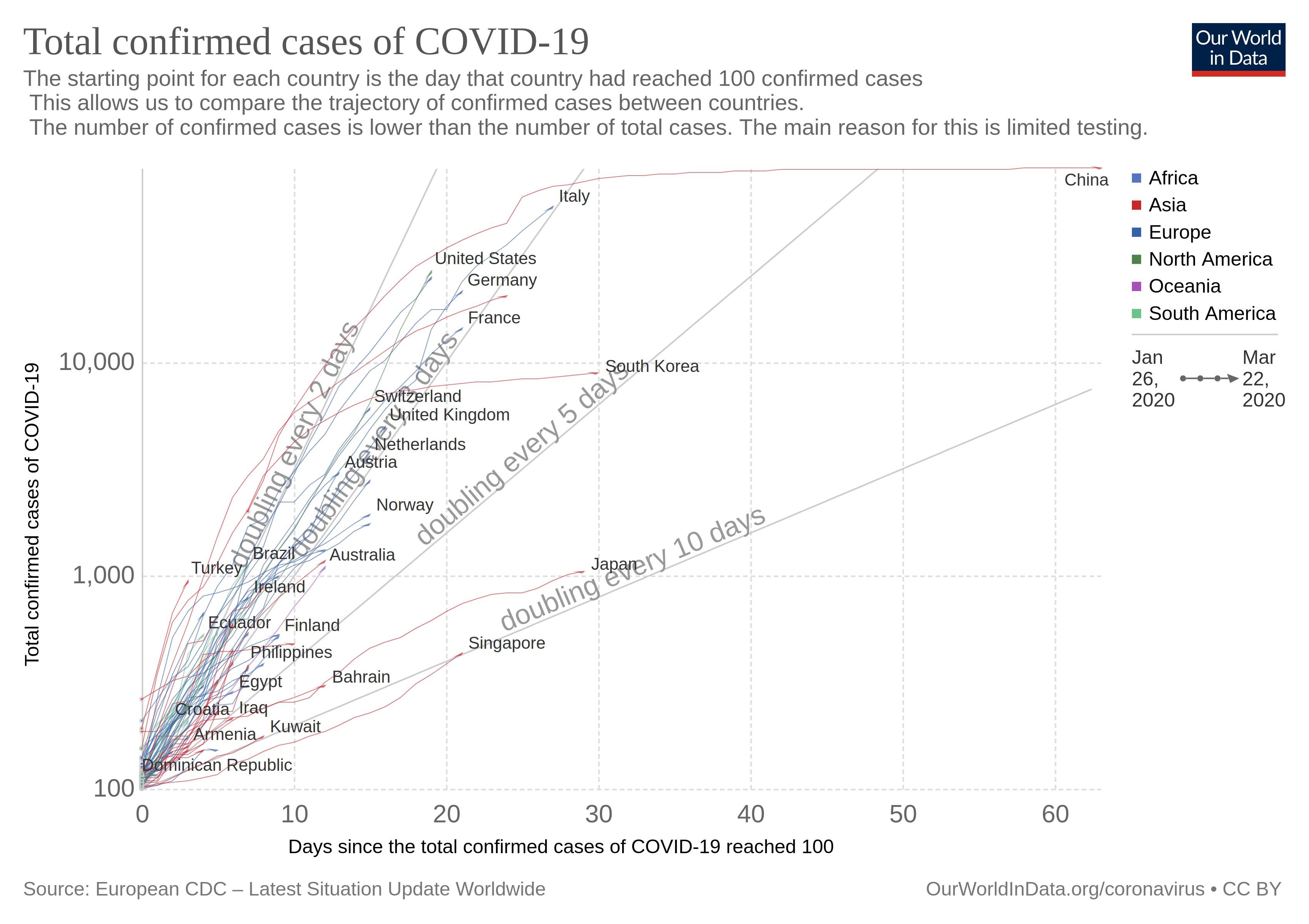 Note the use of log 10 scale! But again, the epidemic started in countries at different times. We would take to take that into account somehow. We can start by looking at days since inception, defined some way or other.