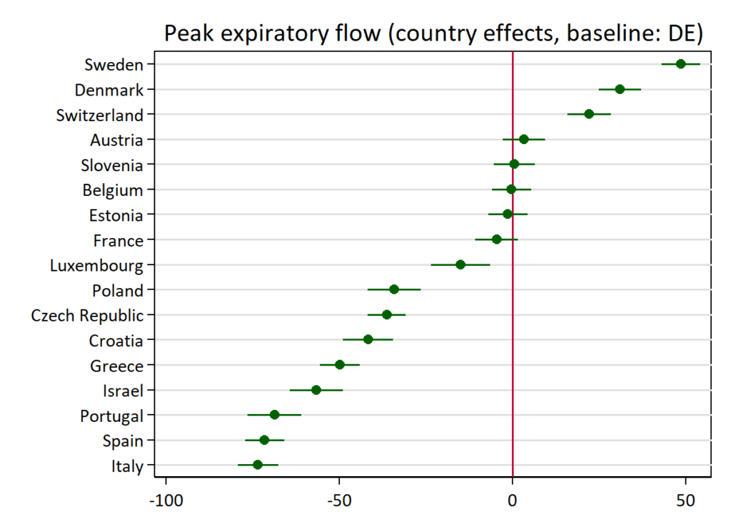 These differ quite a bit for whatever reason. They are affected by age, sex, height, smoking status, but even controlled for these, there are large differences The metric is this one: Peak expiratory flow (highest velocity of air blown out from lungs using a small test).