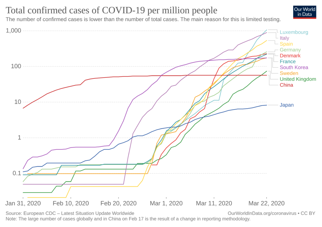 But this is again the faulty measure of confirmed cases, not per capita either! Can we get the above but using population size adjusted and deaths? I couldn’t find it, but I have seen it before on Twitter, so may need to update this post with it. Found it, thanks to Arjen Gerritsen. From this website:
