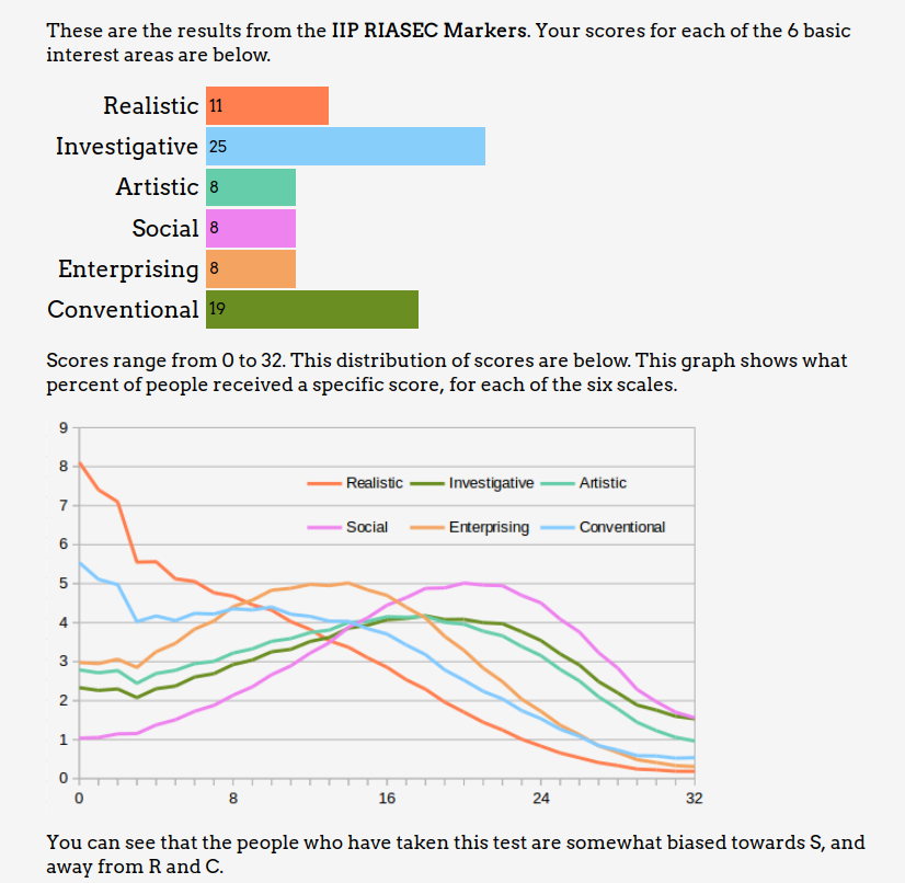 It may still be a little too abstract, so I suggest simply taking an online version of the RIASEC scale. This isn’t the best version because the questions are quite outdated, but you get the idea: