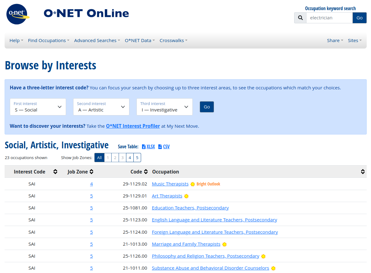 So the differences are very large on interests as measured by these scales and in very obvious ways: women don’t like engineering, they like helping, health and children. Insofar as we don’t think these are perfectly reliable or construct valid measures, the differences must be larger still. (I mean, I guess you could hope for measurement invariance testing showing the gaps are not real, but it’s an unwise gamble.) The US bureaucracy has created a list of jobs by their RIASEC categories. This means that one can give people RIASEC tests, and then present people with a plausible set of jobs, something that Linda Gottfredson has written about for some decades. Here’s the O*NET results for someone interested mainly in Social Artistic and Investigative jobs (SAI, in that order):