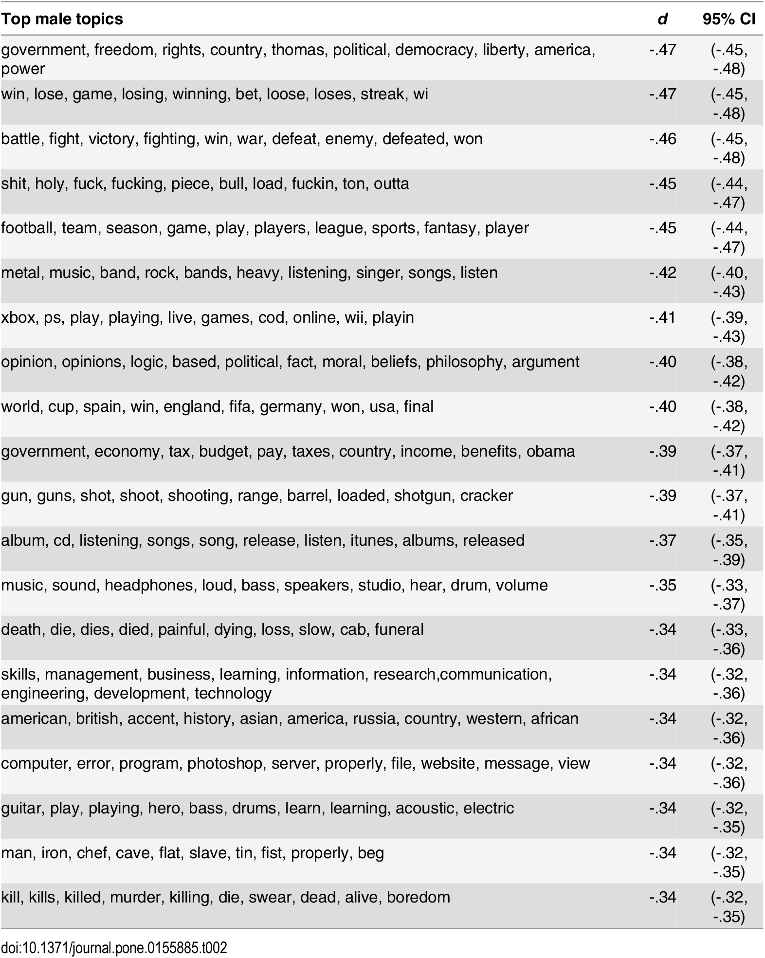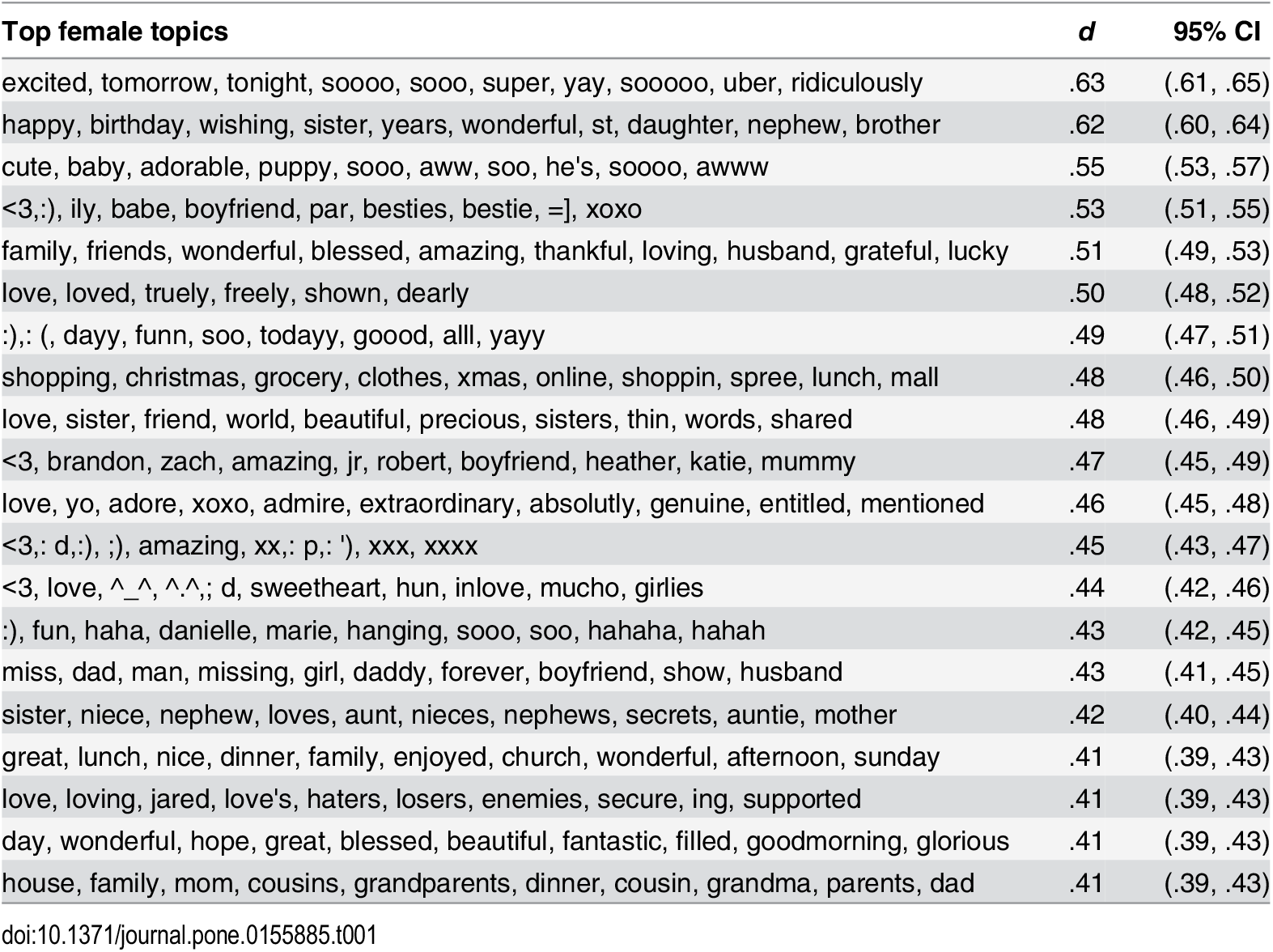 Tables 1 and 2 list the top 20 most female- and male-linked topics and their corresponding effect sizes (see Supplement 1 for full list of 1,281 topics and effect sizes). The most strongly female-linked topics included words describing positive emotions (e.g., “excited”, “happy”, “<3”, “love”,), social relationships (e.g., “friends”, “family”, “sister”), and intensive adverbs (e.g., “sooo”, “sooooo”, “ridiculously”). Strongly male-linked topics included words related to politics (e.g., “government”, “tax”, “political”), sports and competition (e.g., “football”, “season”, “win”, “battle”), and specific interests or activities, such as shooting guns, playing musical instruments, or playing video games. Note that topics are semantically-related clusters of words identified automatically by latent Dirichlet allocation. In Tables 1 and 2, Words are ranked in descending order of prevalence (weight) in each topic.