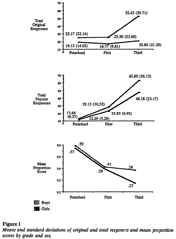 Assessed the development of sex differences in the creative potential of 188 preschool and early elementary school children (aged 46–216 mo). Ss received the Multidimensional Stimulus Fluency Measure developed by J. D. Moran et al (see record 1984-01004-001) to assess creative potential in terms of popular and original responses (ideational fluency). Comparisons of the preschoolers, 1st graders, and 3rd graders indicated that sex differences emerged throughout early elementary school. No sex differences were found within the preschool sample, but by 3rd grade, boys scored significantly higher than girls on popular and original responses. Findings are discussed with regard to evaluation, conformity, assimilative strategies, and environmental factors.