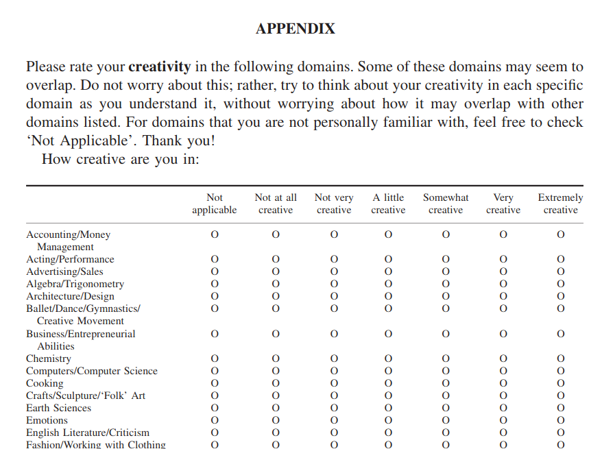 - Self-report of creative behaviors, then score this
