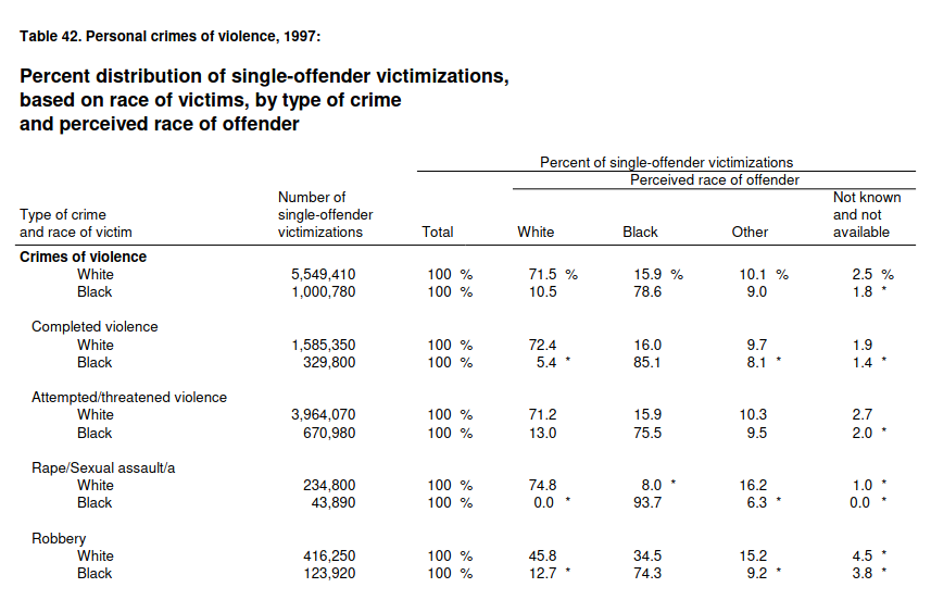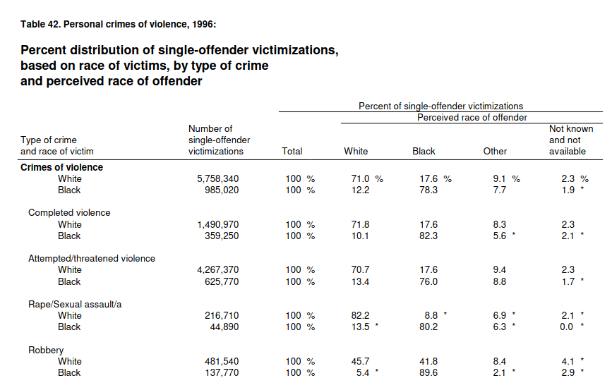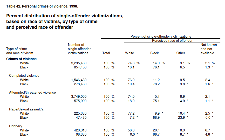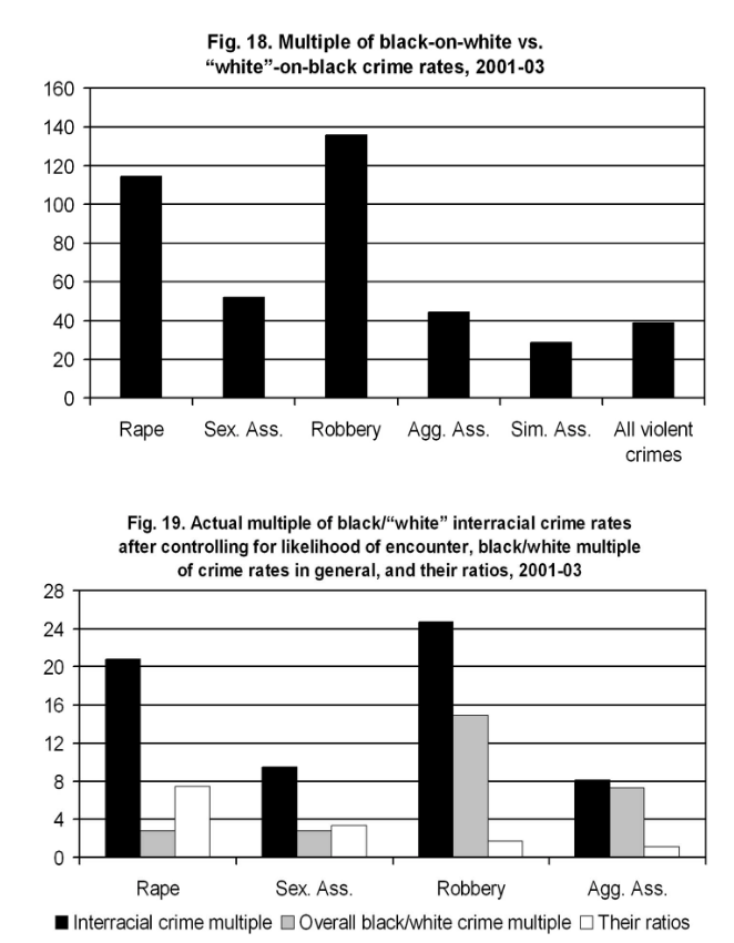 So races clearly cluster among each other. As such, we would have to make assumptions about how far from home a rapist attacks. I seem to recall most criminals ‘do their work’ around their own homes, so in this situation, most potential victims are from the same race. For Blacks to attack Whites, they would have to go out of their way to some White (or Asian etc.) area. Similarly for Whites. The report The Color of Crime (2016) gives helpful comments on interpretation of interracial crime data: