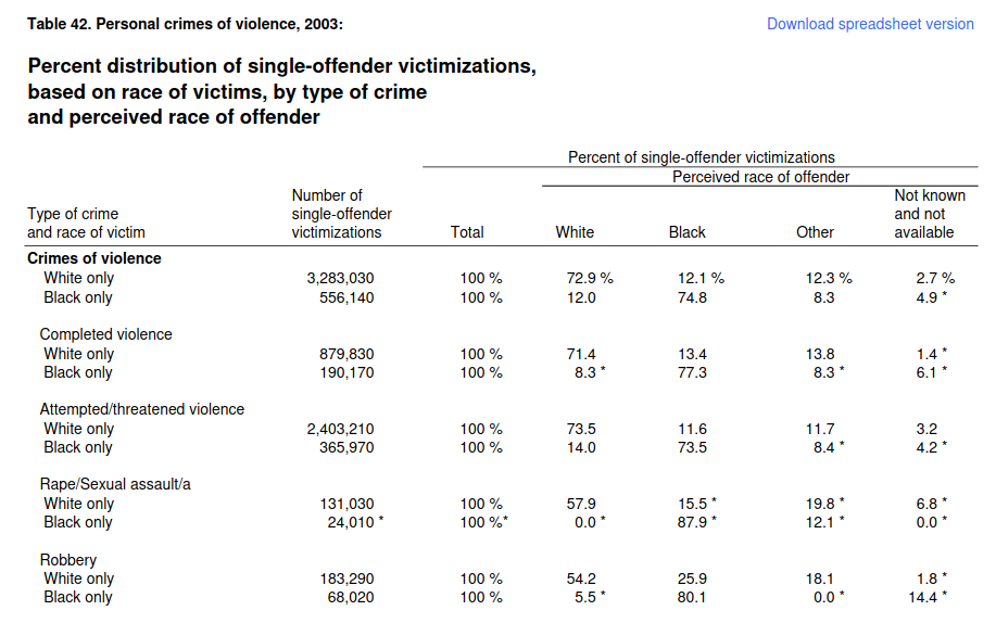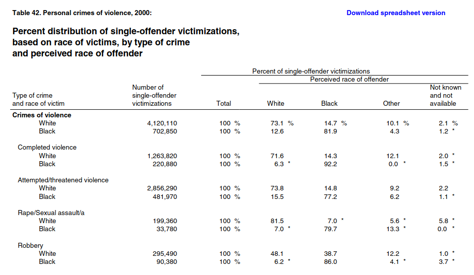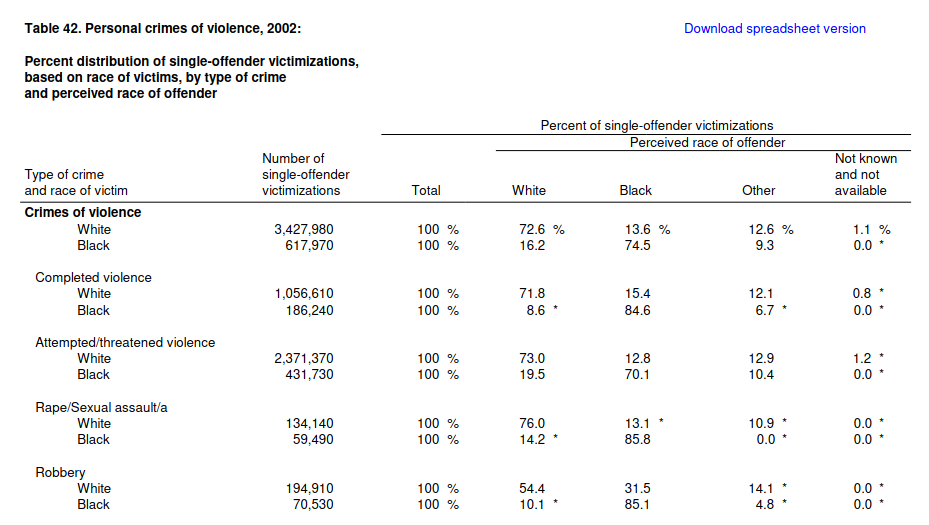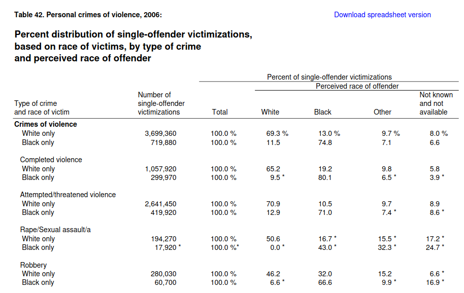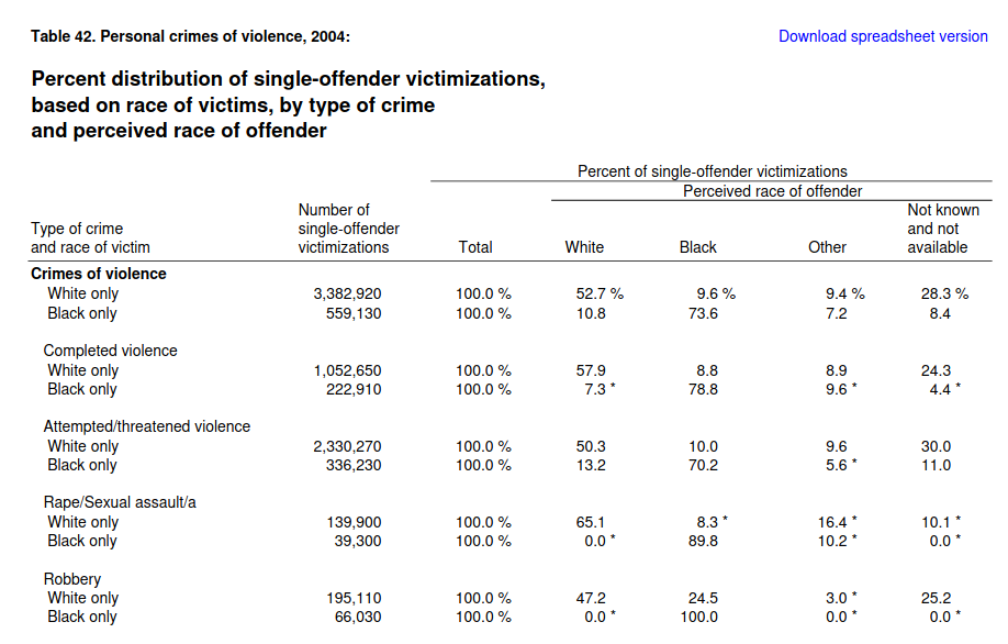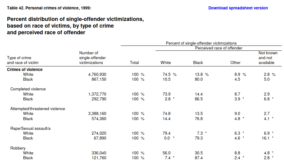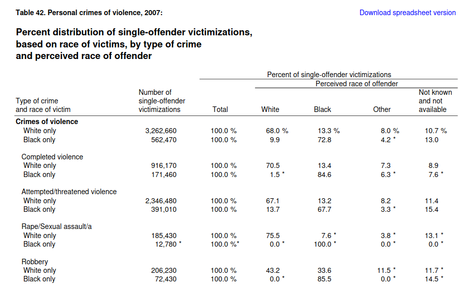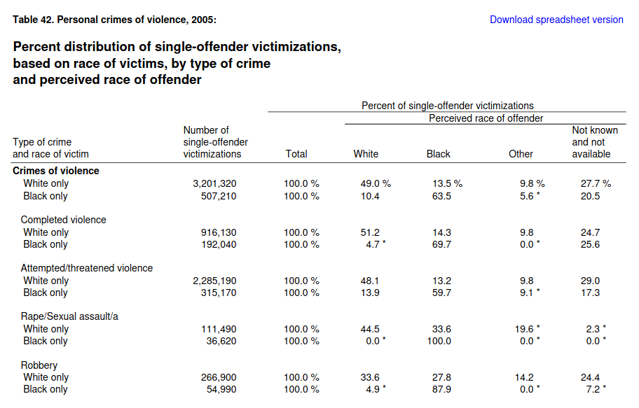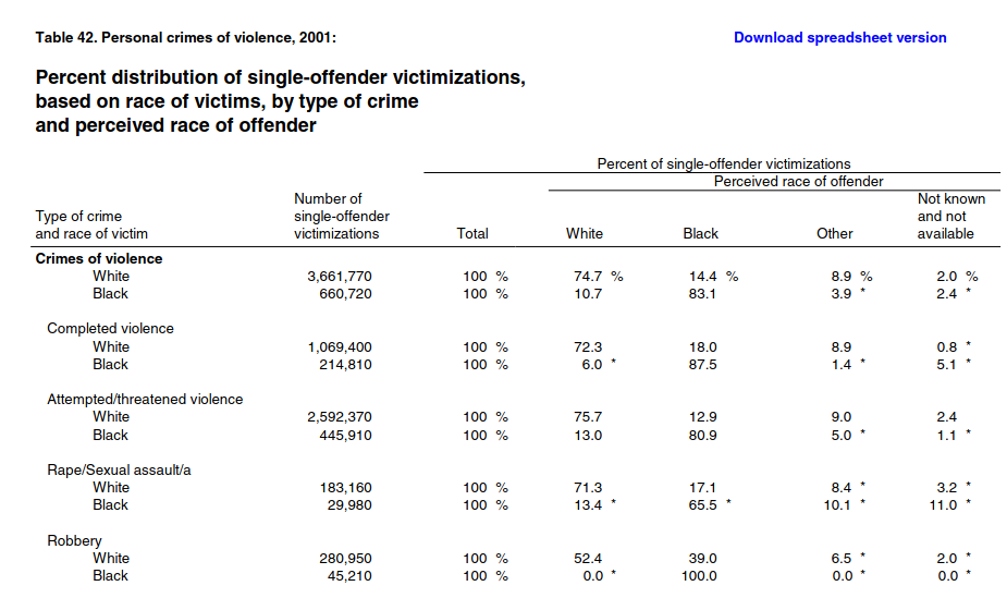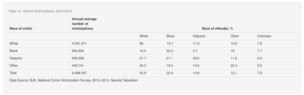 As noted above, in 2009, the US Justice Department’s National Crime Victimization Survey (NCVS) stopped publishing data on the races of criminals. Recently, however, figures from the 2013 NCVS were released in which blacks, whites, and Hispanics were, for the first time, treated separately.