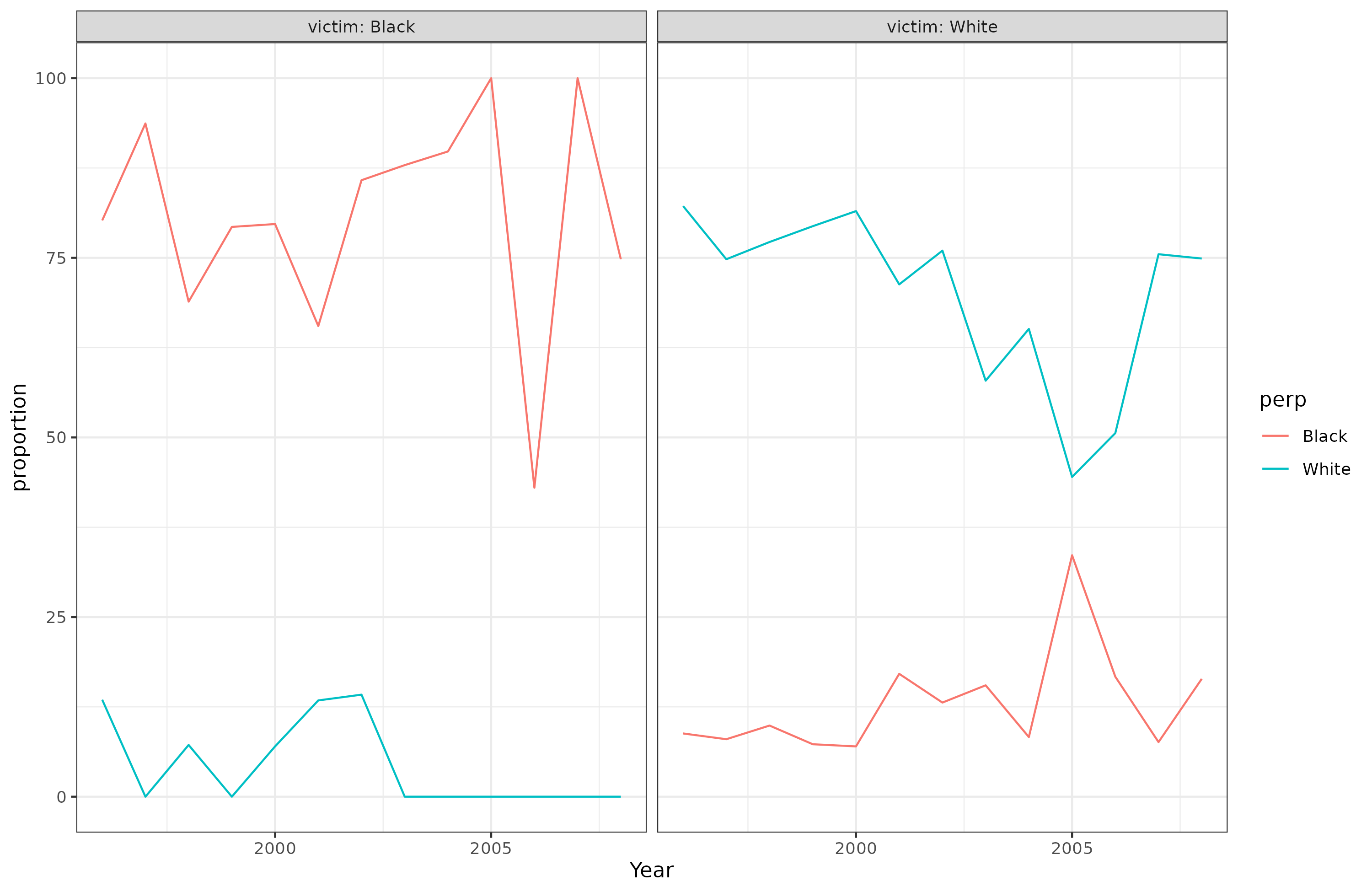 The numbers are scaled to the proportion of offenders for each victim race. Data for non-Black non-White races are not given for victims (sample too small probably). I skipped the data for the offenders for the other races. We see that White on Black rape is indeed very rare, and the results from the year 2008 are not unusual. Across the 13 years of data, the proportion of White on Black rape is a mere 4.25%. However, the Black on White rape is increasing over time with a mean of 13%. Similarly, the White on White rapes are decreasing because the rapes are increasingly done by men from other races. Philip Cohen is thus wrong that 2008 is just an outlier.