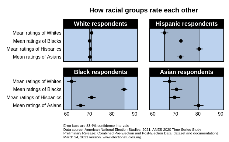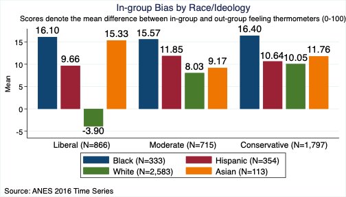 So Whites basically show complete color-blindness, rating other groups the same level of warmth as their own group. The other groups show the strongest warmth for their own groups, and the lowest for Whites. In other words, the pattern is exactly the opposite of the popular narrative. Whites are egalitarian, the other groups are racist and especially against Whites. In fact, one can look into the White group by ideology and see that White leftists also dislike whites, following the media narrative. Data from ANES 2016 analyzed by Zach Goldberg:
