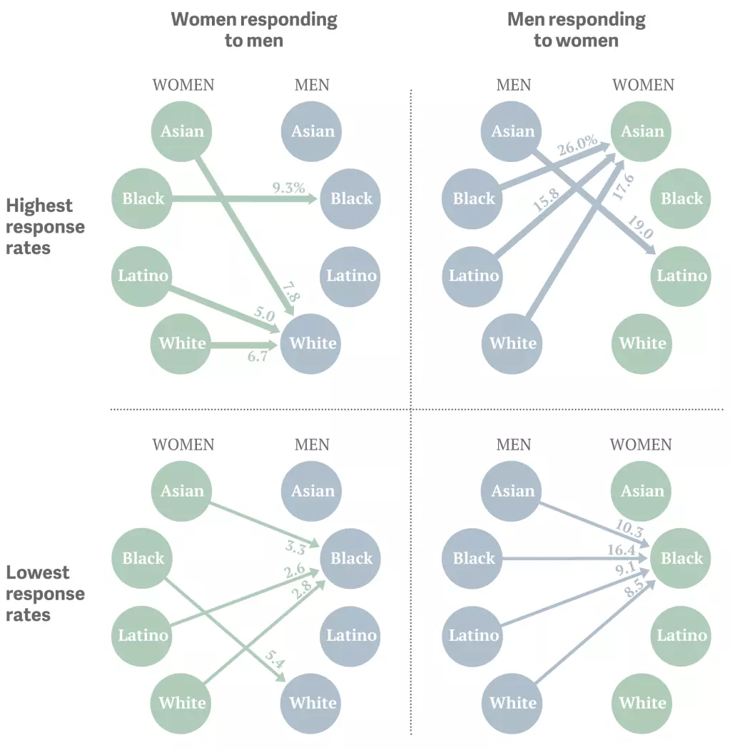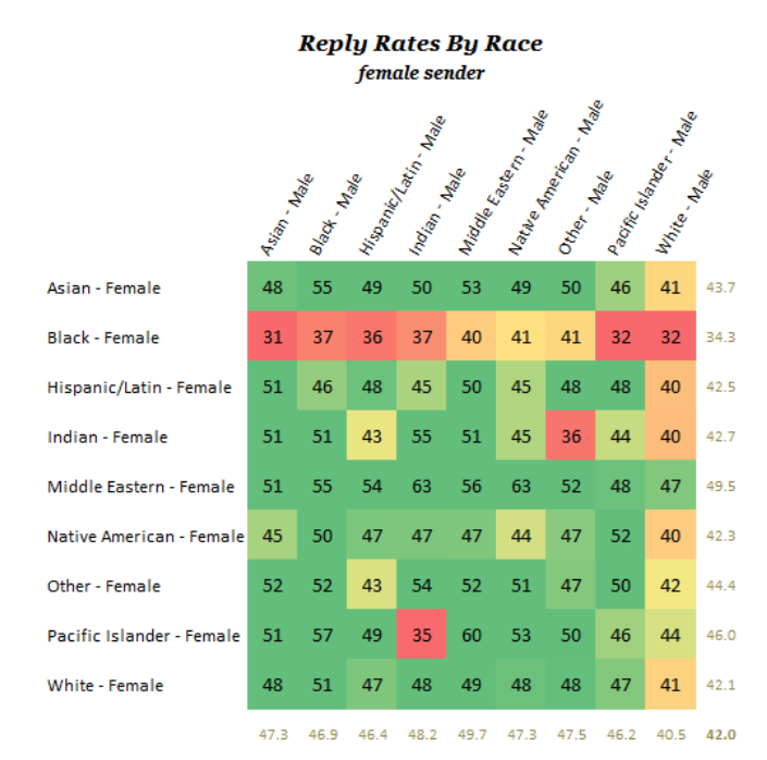 So Asian and White women are considered more attractive. This should thus explain some of the pattern, as White men particularly don’t find Black women attractive, but Black men don’t have strong opinions about the race of women. One could consider that a part of fast-life history/high sociosexuality. Aside from OKCupid ratings, there’s also the more informative reply rate to women who send messages: