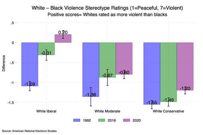 In fact, there are stereotypes measured about violence, and White leftists even manage to rate Whites as more violent than Blacks for the first time (again from ANES and Goldberg):