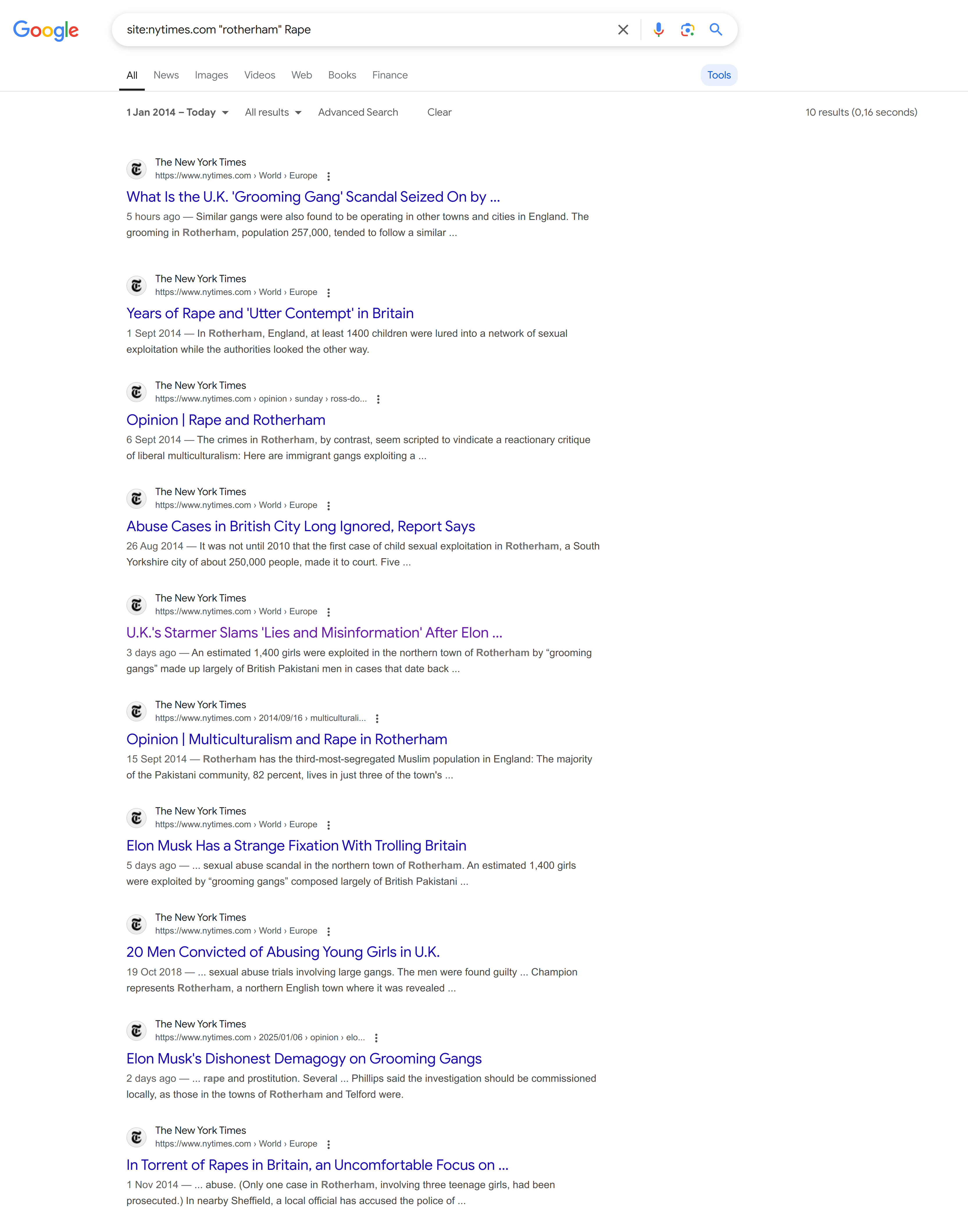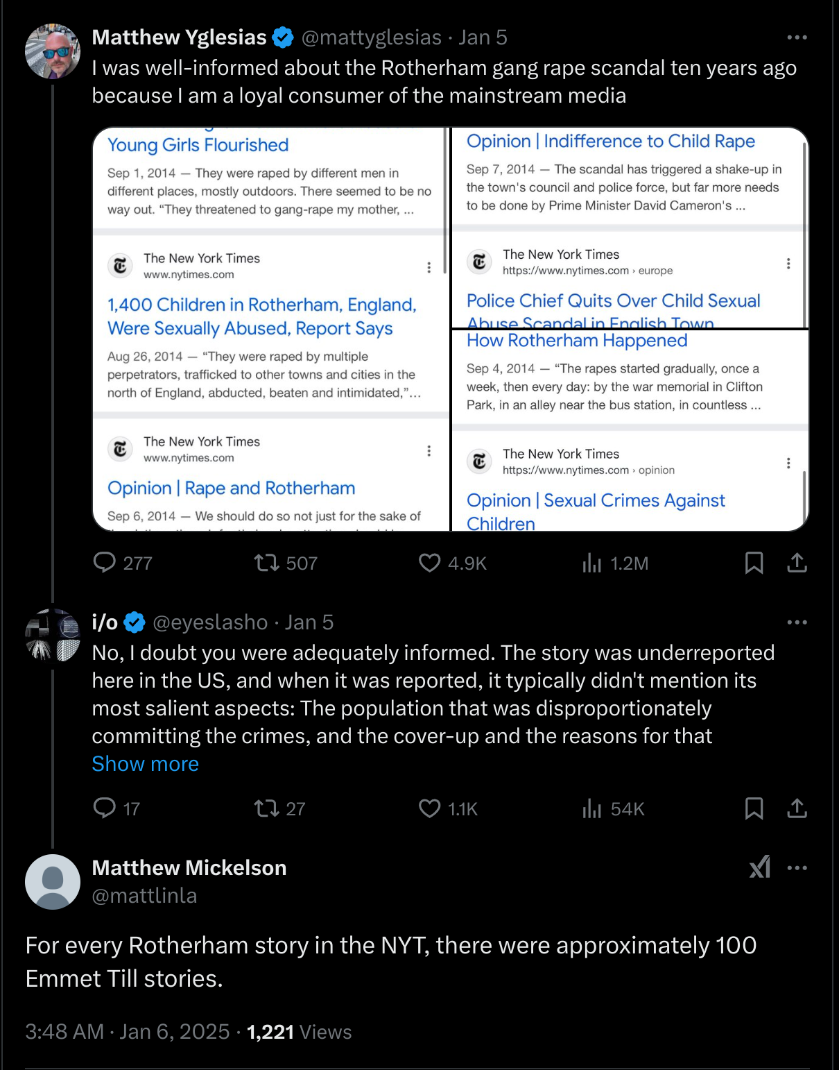 So there we have it. 5 writings about systemic rape of British girls from before this week, and 600+ about Emmett Till, an African American boy who was killed 25,337 days (69 years) ago. Depending on interpretation, then, it seems Matthew was just about right about what the focus of New York Times has been. Granted, of course, that Emmett Till was an American, and Rotherham is in the United Kingdom.