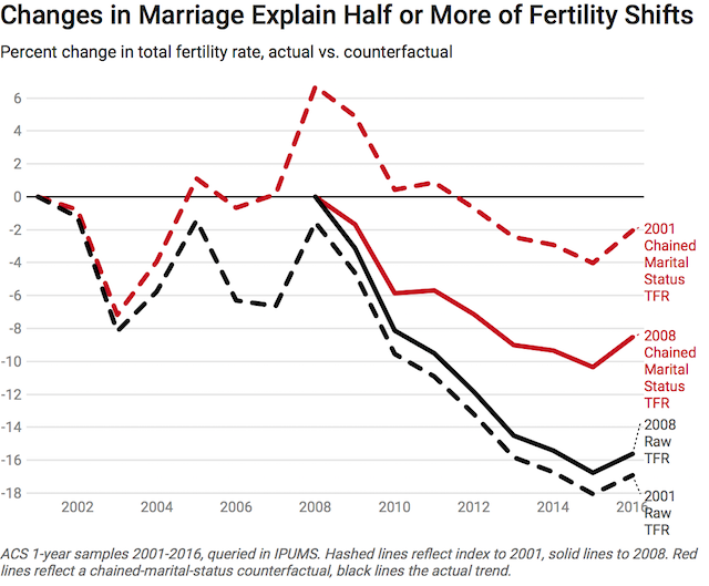 However, the marriage % is declining. Statistically, this marriage decline explains a great deal of the fertility decline: