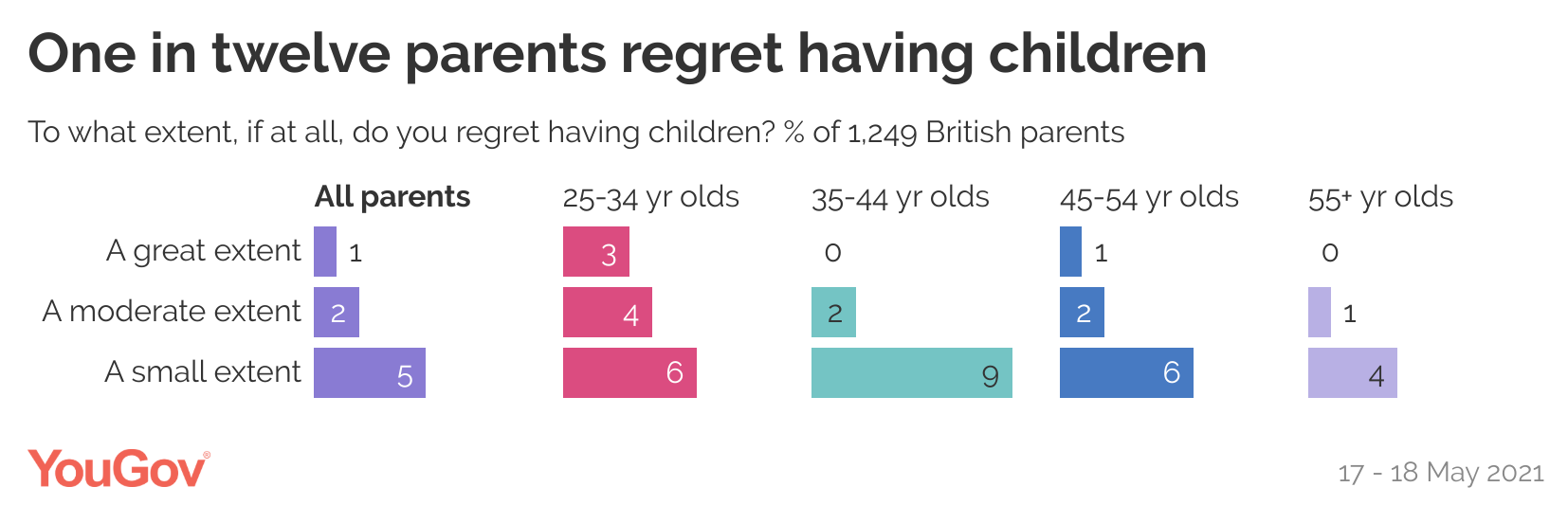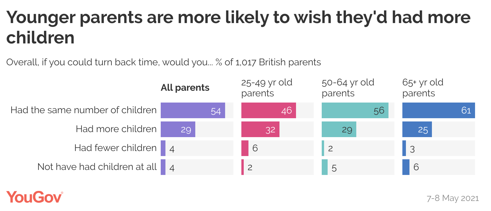 So, of those who had no children at age 45, 56% wish they had more. Of those with children, only 7% wish they had none. There’s also a UK replication from 2021: