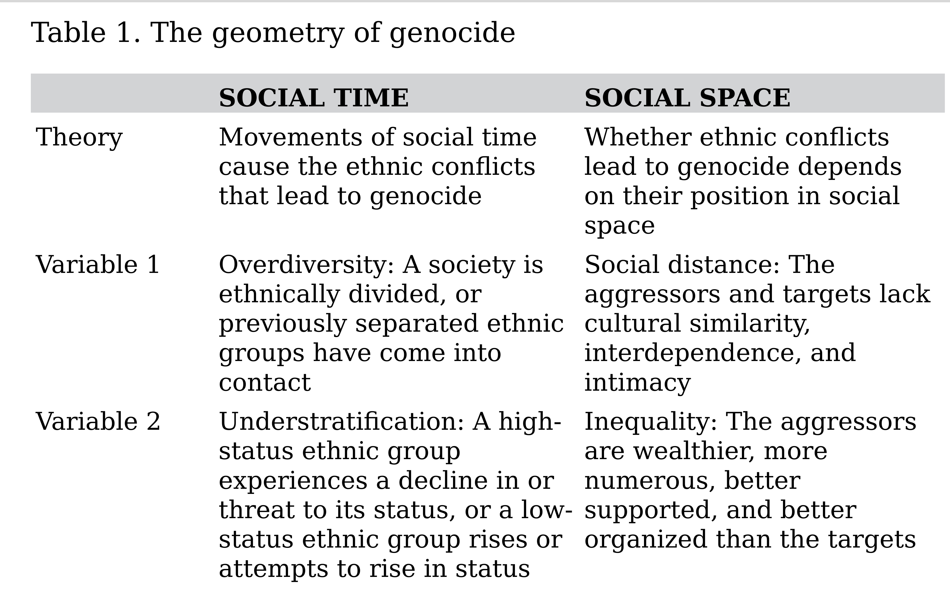 Some time ago I read Bradley Campbell’s The Geometry of Genocide: A Study in Pure Sociology. Like his other books, it’s short, to the point, and well worth reading. First, the subject matter: