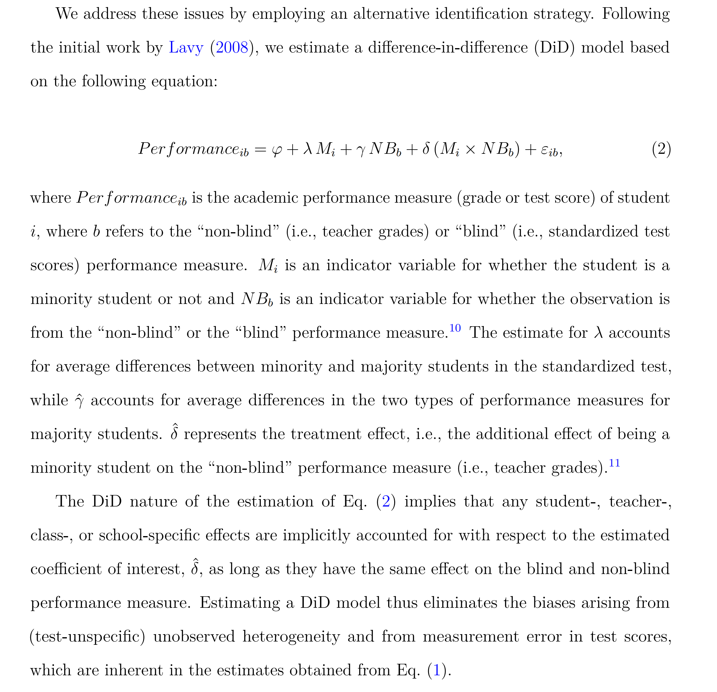 You see the outcome variable is the dataset stacked, so that half the values are from tests and half from grades. A dummy variable is added to indicate this, and it’s interaction with minority status is estimated. Thus, we just get the difference between the gap sizes for the same students on the two measures of academic ability. Please correct me if I am wrong. If I am right, and grades are worse measures of academic ability, then this estimate of teacher bias is too large. The true value will be somewhat larger than the values in the first table, since these have to be adjusted for measurement error. The authors could have just used SIMEX I think.
