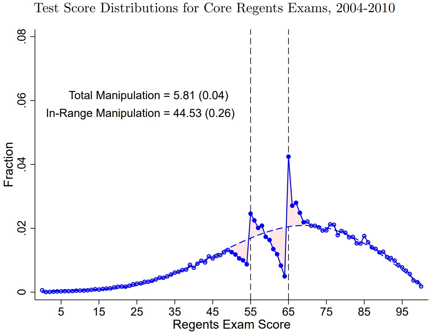 In New York, seniors take the Regents Examinations in order to graduate. When teachers became the graders instead of having a centralized state-level authority doing the grading, they very clearly cheated so more students would pass. To obtain a low-level “local diploma,” students had to score 55 on the exams; to obtain the prestigious “Regents Diploma,” they had to score 65. Scores in years where teachers weren’t doing the grading were nearly normally distributed; when the teachers took the wheel, there were an excess of scores at either cutoff: