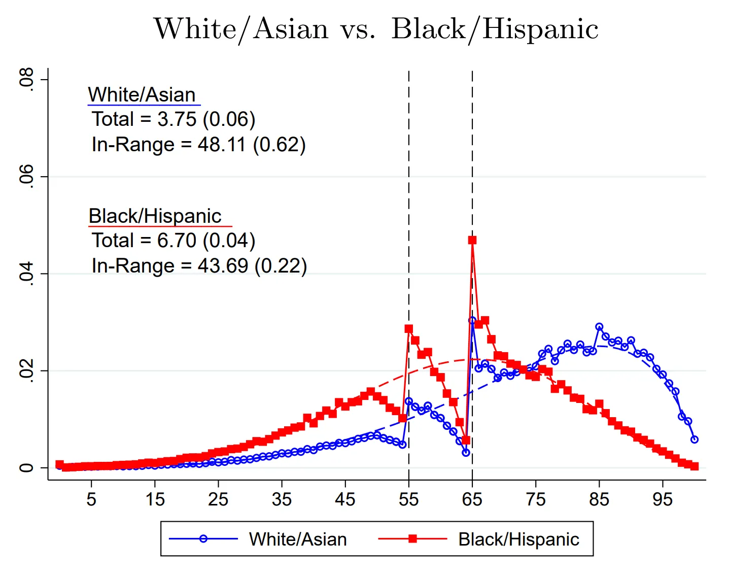 This cheating behavior led to the tests being biased in favor of Blacks and Hispanics over Whites and Asians, but the reason doesn’t necessarily have anything to do with racial discrimination by teachers in favor of Blacks and Hispanics.5 Instead, it has to do with Blacks and Hispanics scoring worse, and potentially with the fact that they tend to go to schools with more low-scorers, which might offer further incentives for teachers to round up. As a result, their mean scores clearly became incomparable to those of Whites and Asians, but the bias was because so many more of them were in need of teachers’ help cheating the grading system so they could pass.