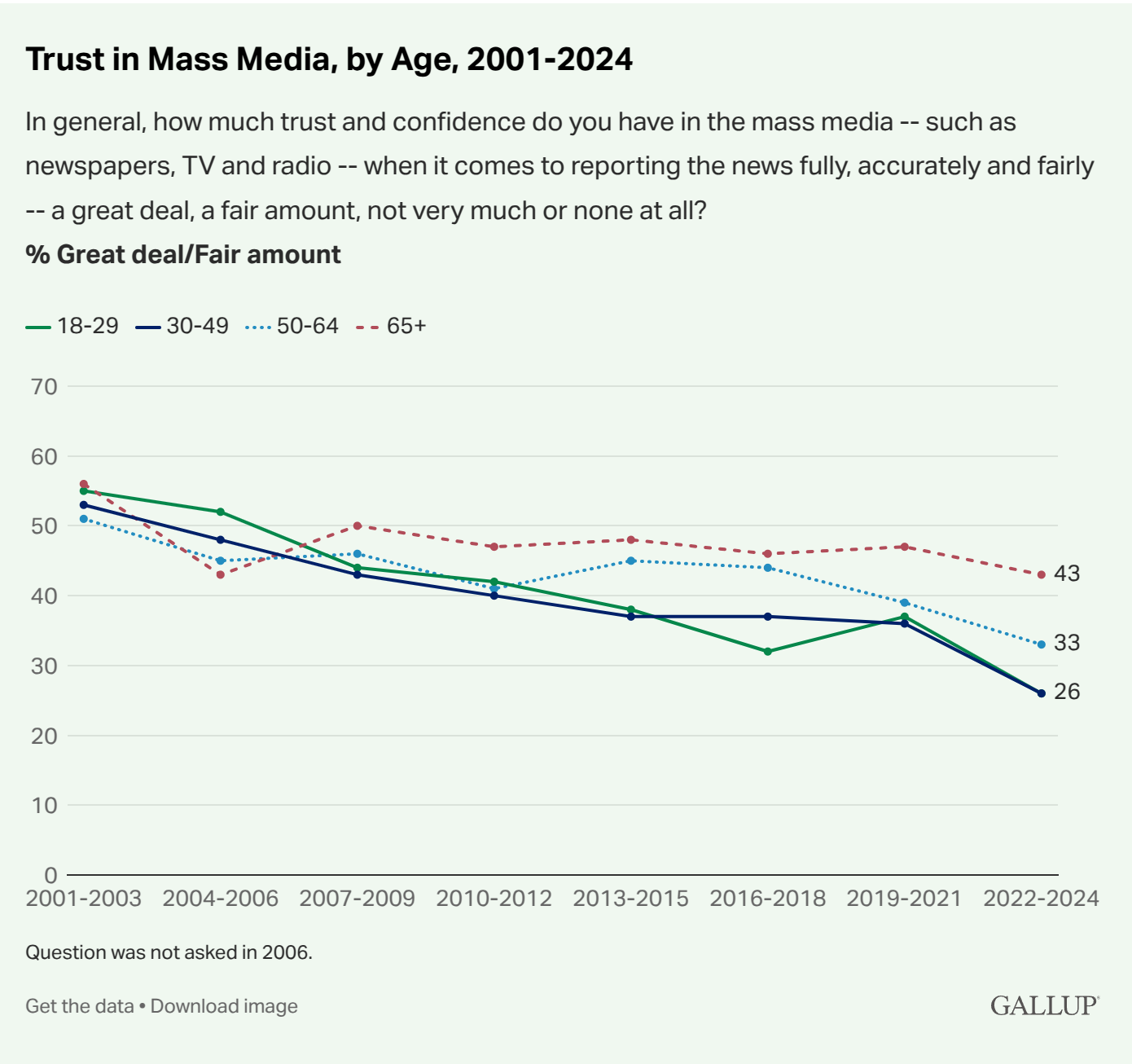 What about trends for journalists? Ipsos did not supply this information by age (‘generation’) unfortunately, but there are long-running surveys from USA: