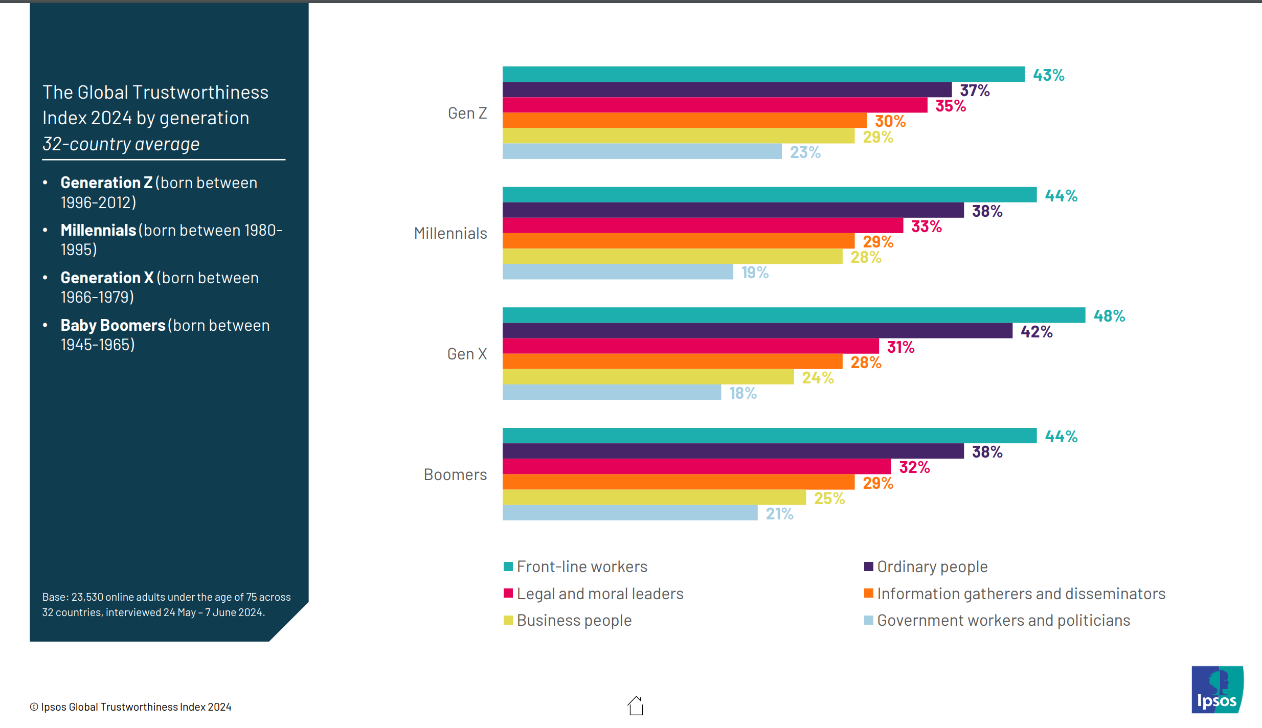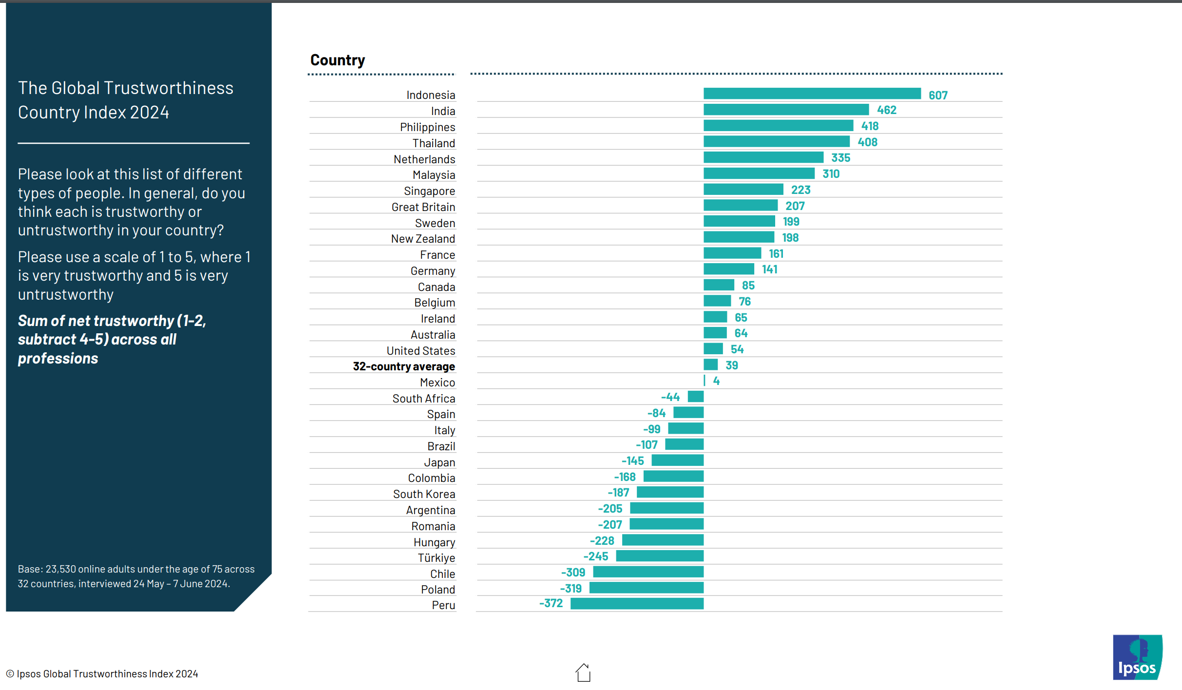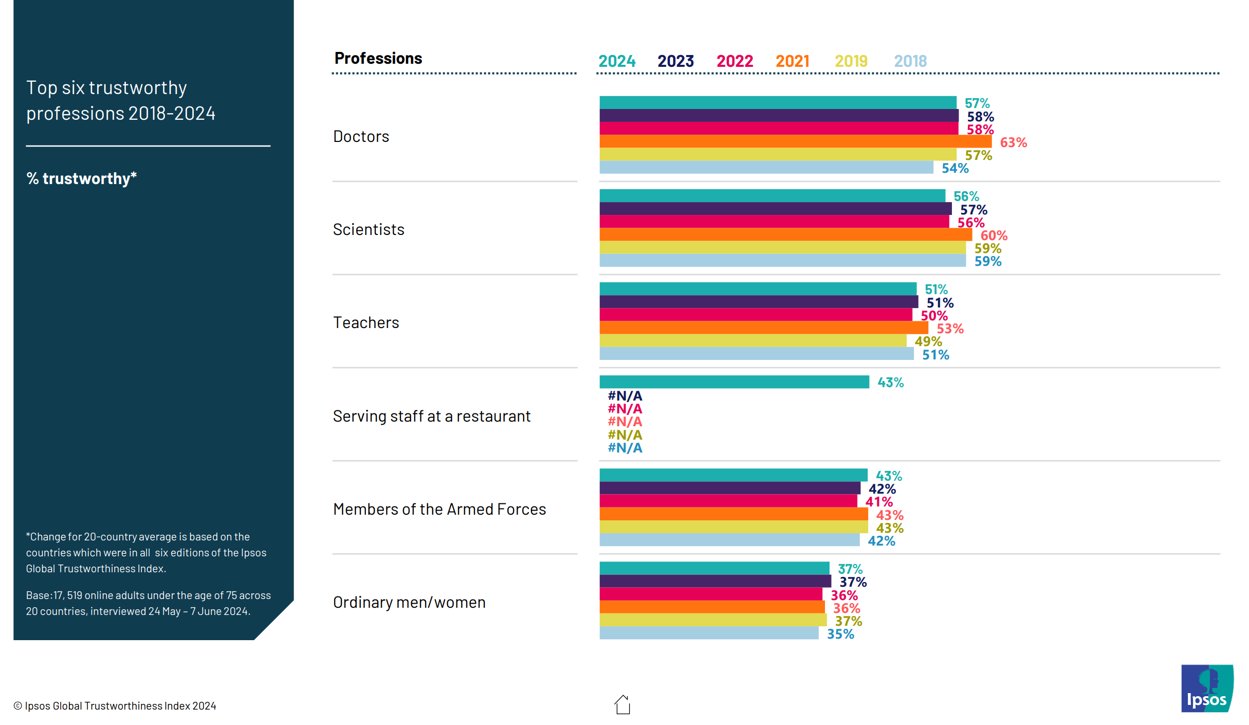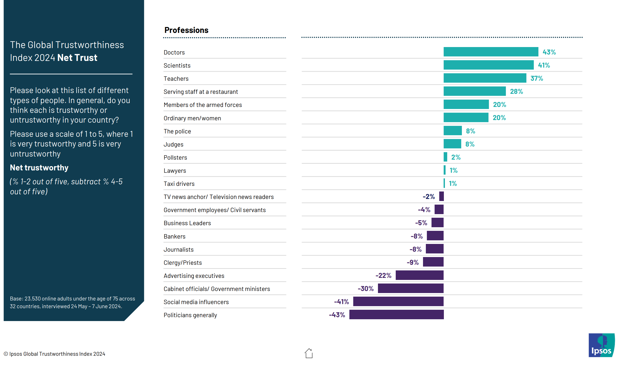 I was going to do a bunch of searchers to find polls of trust in different occupations by country. However, it turned out to be unnecessary because Ipsos has already carried out a 32-country survey. They asked people to rank each occupation on a 1-5 scale, which they then recoded into trust (4-5) or distrust (1-2). The global average is this: