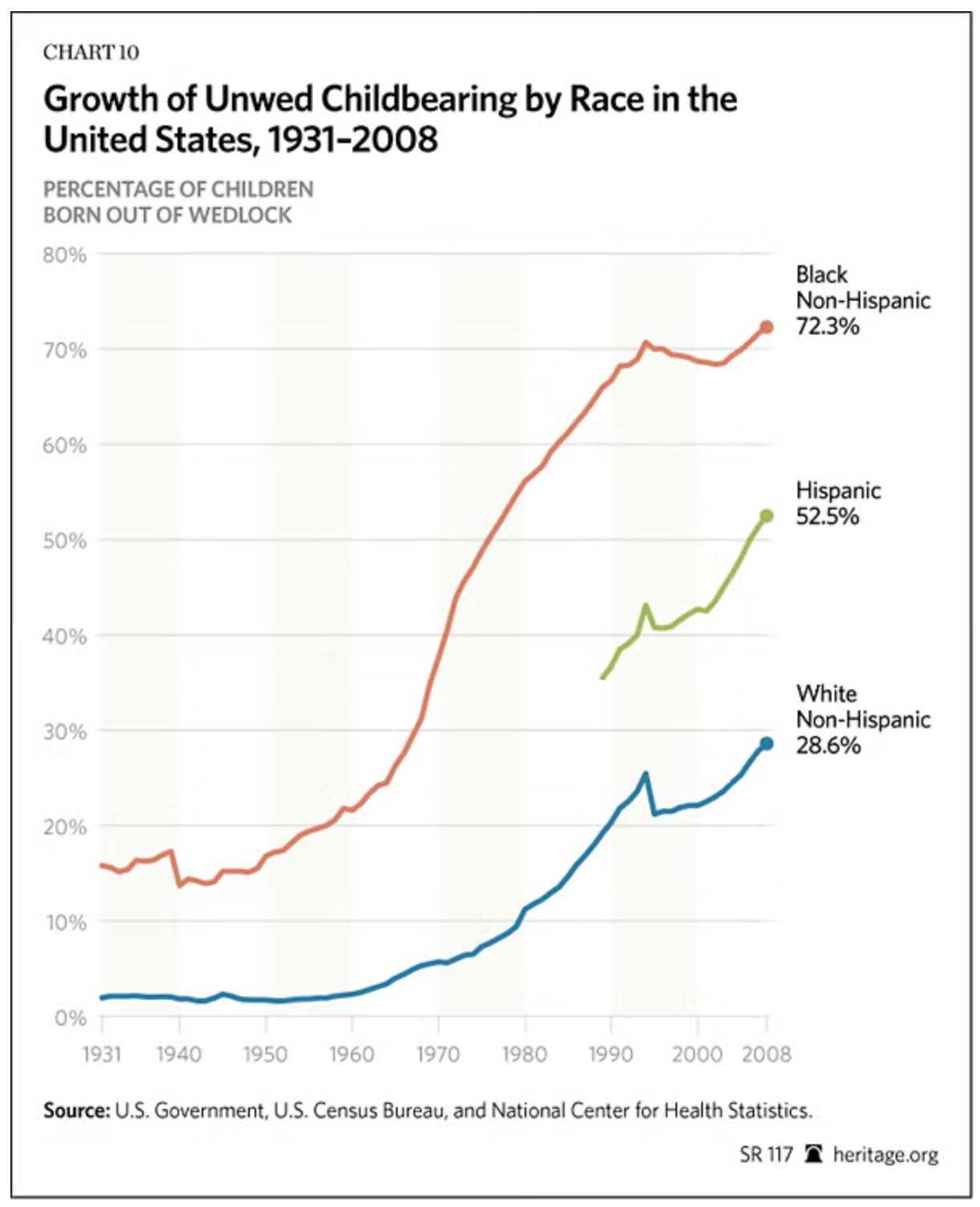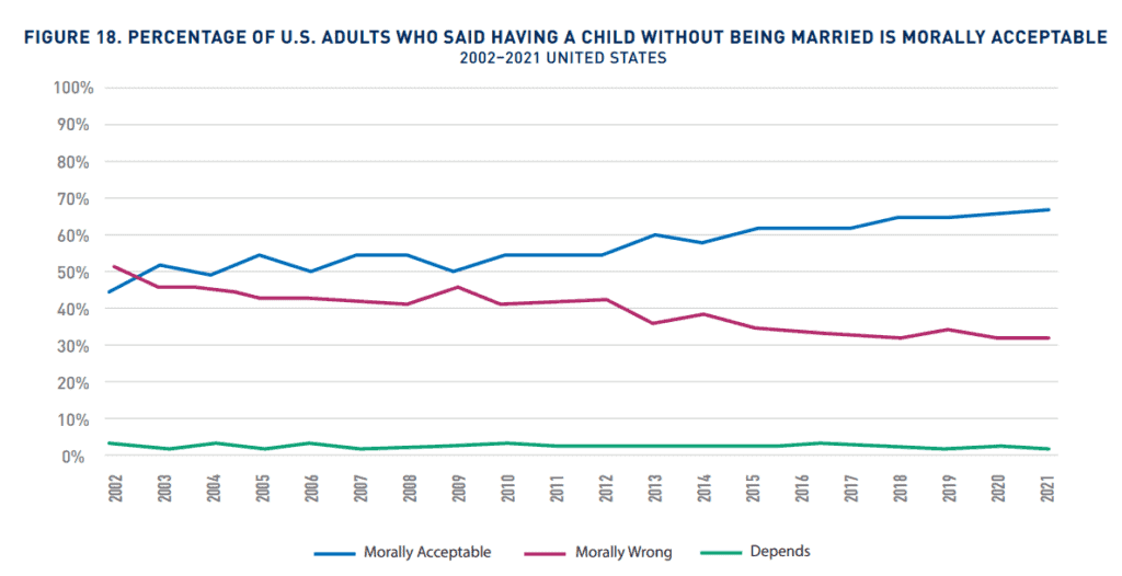 There is a stark decrease in ‘out of wedlock’ (outside marriage) births, especially in Blacks. This relates to what they consider moral decline: