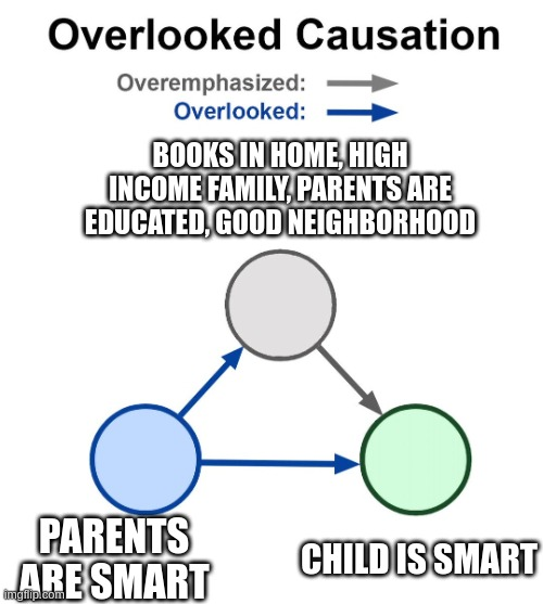 If we have to name the single largest problem with social science in itself it is that of confounding (in real-life social science, the bigger issue is probably statistical cheating with p-hacking, selective reporting and publication bias). We have tons of data from surveys and government registers, but when we examine it and find that two things are statistically related, how do we know this association is not merely statistical, but causal in nature? Finding causes of things is the main goal because making good decisions depends on knowing causes for the most part. It’s far too easy to come up with a plausible sounding mechanism for any observed association, so this cannot be much evidence of causality. Jonatan Pallesen has been promoting this useful meme for pointing out confounding in common claims: