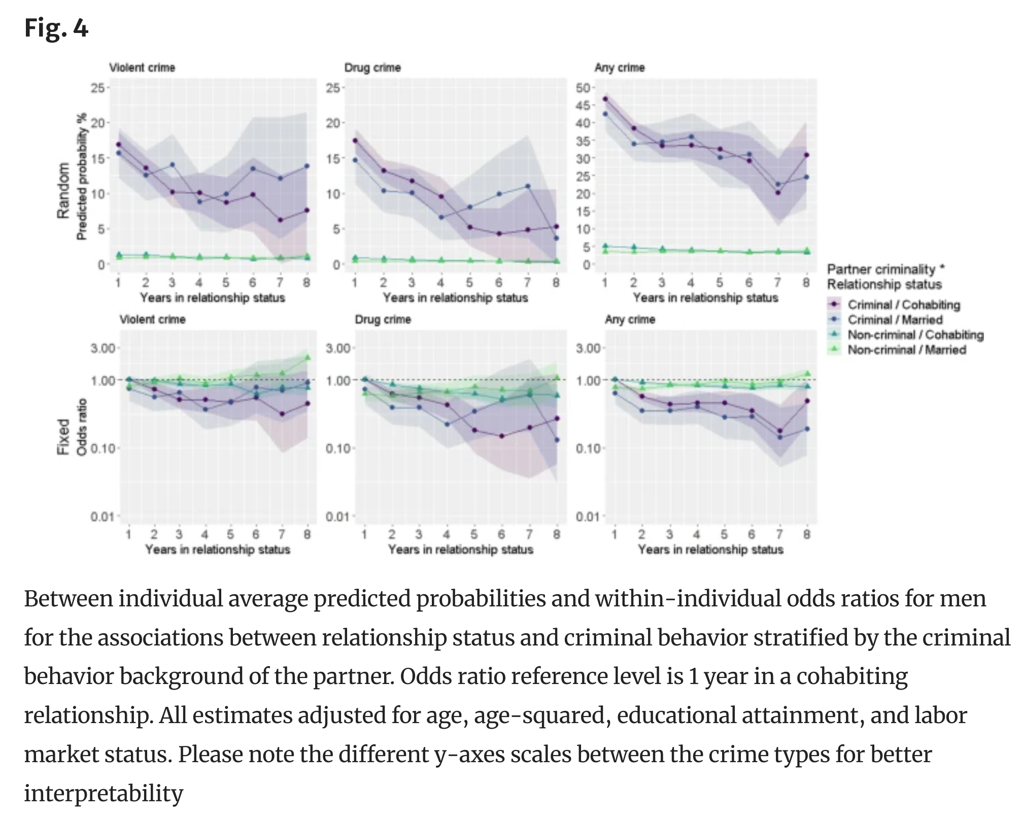 Can we get around the problem? Well, yes. Some children by the same parents are born when the parents are married and others later or before. One can also expand the definition of ‘married’ to include de facto civil marriage (long-term cohabitation). I am not aware of a such study, but it might exist, and it could be done using Nordic register data. However, does marriage have good causal effects in other ways? Here’s two informative studies regarding crime:
