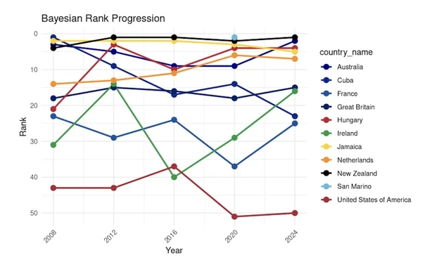 Unfortunately, only this small grainy figure. We see that America does rather poorly, ranking 50th in the world. New Zealand is apparently the true king of the Olympics per capita. I wasn’t able to find a full length Bayesian analysis of the Olympics, but maybe it exists. I am not that much into sports, but maybe Steve Sailer can jump in and find it.