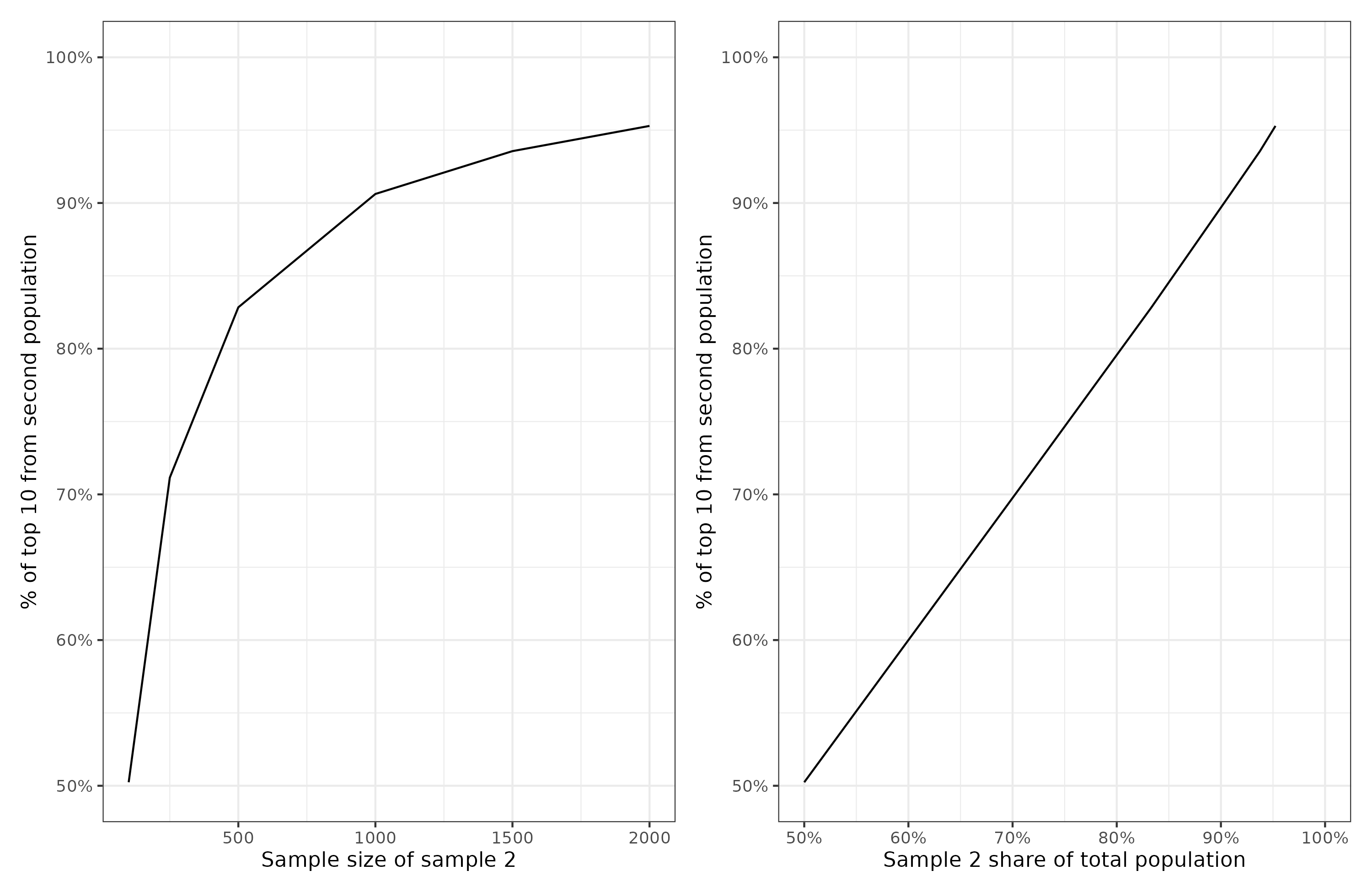 Italy and France got many wins and nominations, but also have relatively large population sizes. Denmark did very well for a small country, and Iceland managed to get 1 nomination with a population size of only ~380k, making it the top scorer for nominations and bottom scorer for wins (r = 0.58 between the metrics, mainly because Denmark is an extreme performer in both). The problem with the per million direct adjustment is that small countries will generally come out in the top and bottom of any such list, no matter their actual latent rate. That’s inherent in the larg sampling error. Here’s a quick visualization: