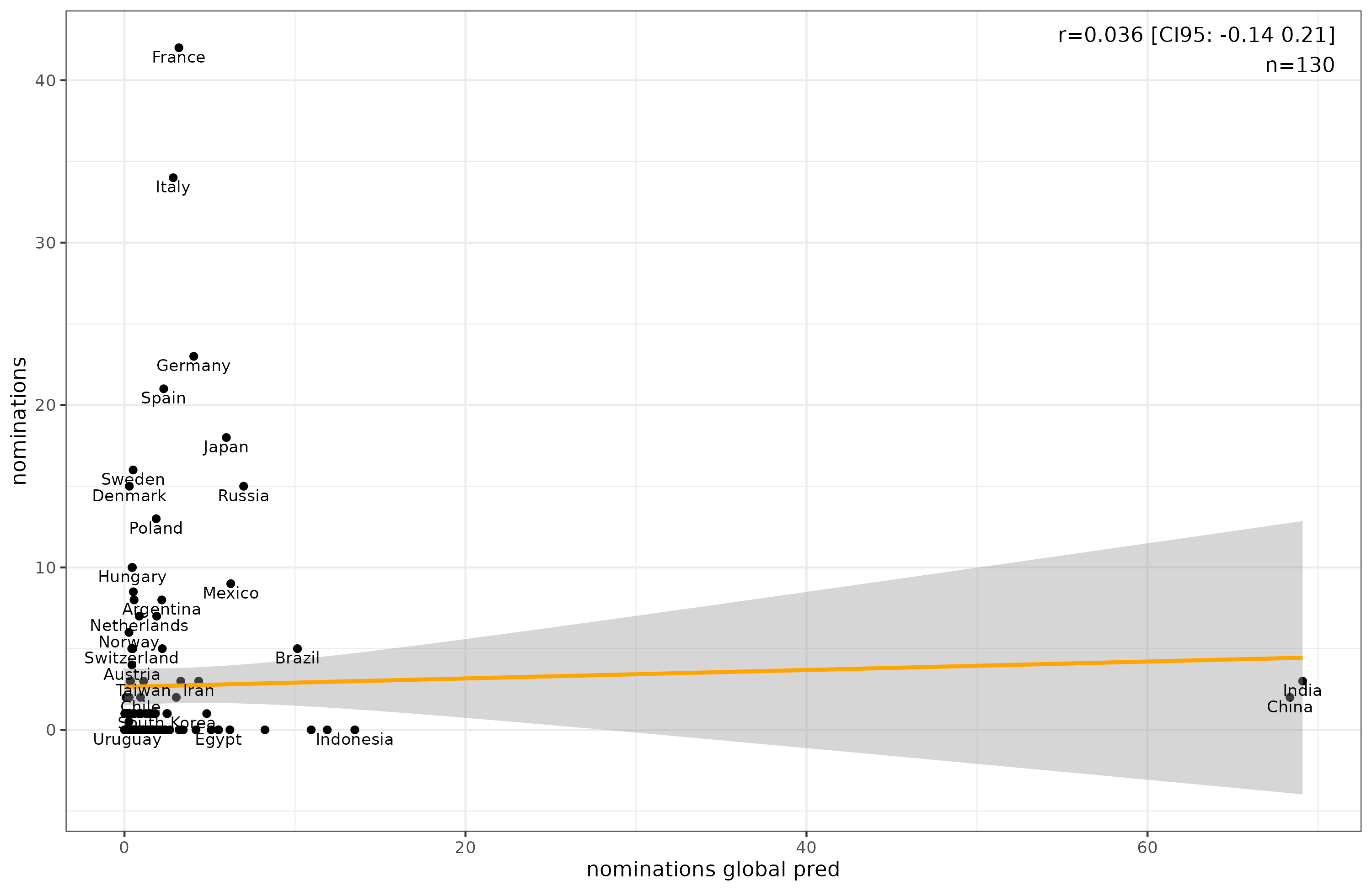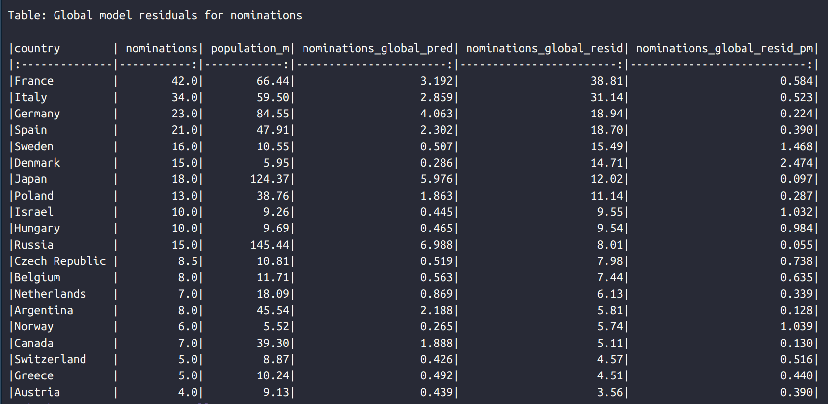 We see that population size by itself is a terrible predictor of number of nominations. The correlation across 130 countries is not even significant (r = 0.04!), mainly because of the extreme outliers of China and India. The difference between the expected (predicted) nominations and actual nominations is the residual (the error, or unexplained part). One could use this to rank countries, but it still has issues with population size. Denmark, Sweden, and Russia have 15-16 nominations, but Russia’s population size is enormous compared to the tiny Scandinavian countries. Here’s some informative metrics derived from this approach: