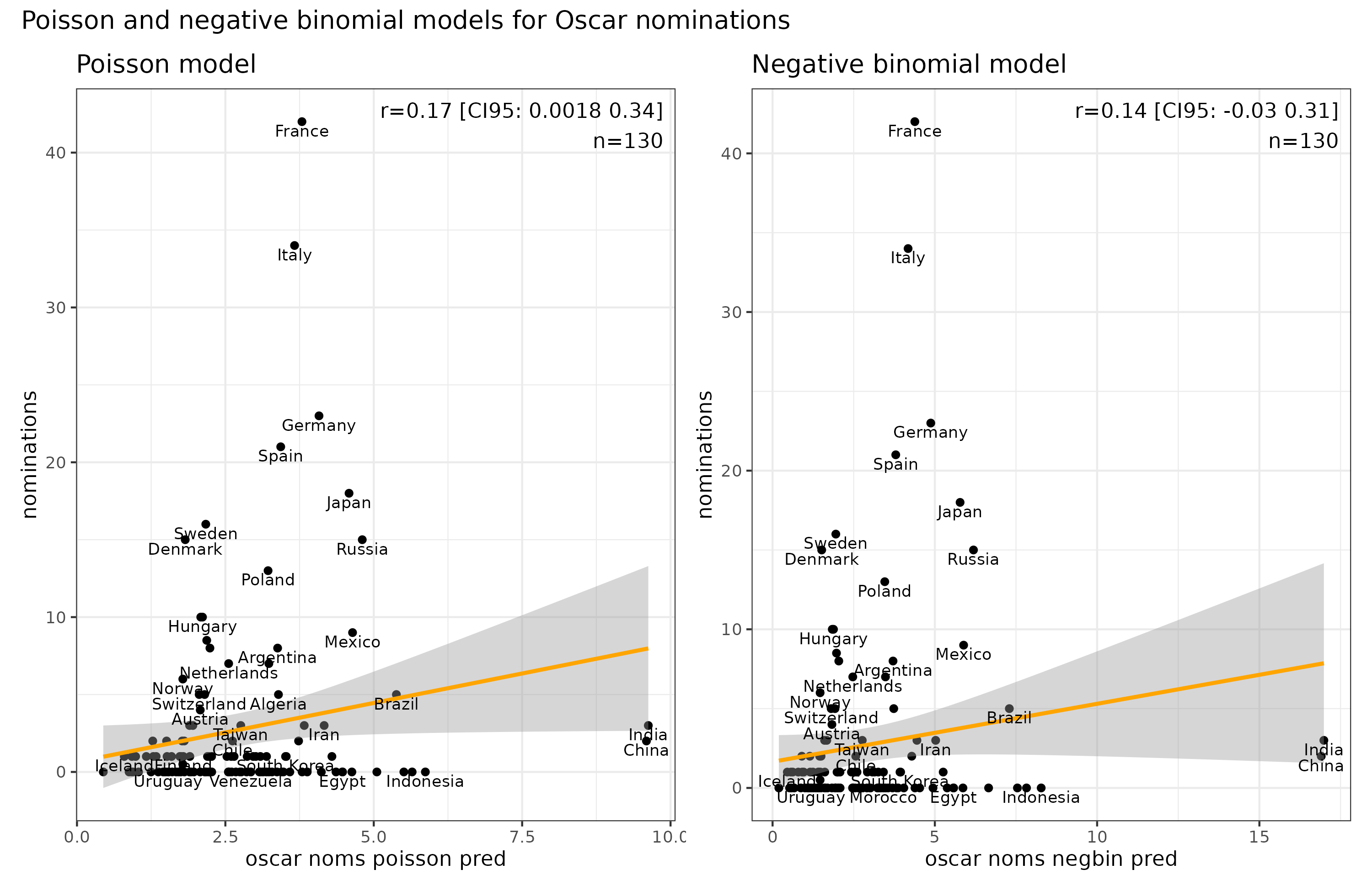 One intuitive way to deal with this problem is to calculate an expected number of wins and compare with the actual number. The expected number is just the global rate per million which turns out to be 0.0105 wins and 0.0480 nominations (I think in modern data there’s always 5 nominations one of which wins, so the ratio should be exactly 1:5, but perhaps not in the older data, or maybe Wikipedia is incomplete). Thus, we can simply multiple each country’s population with these rates to get their expected counts and compare with their actual counts. I will focus on nominations because there is more data for these (77 wins, 353 nominations).