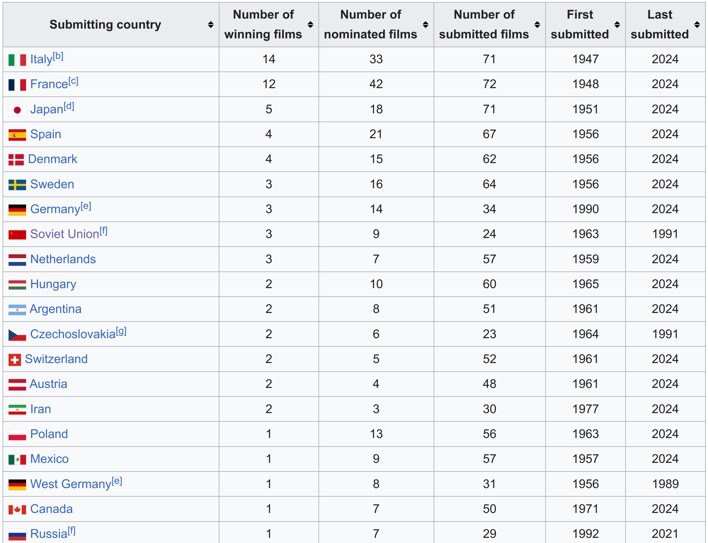 Second, start with the list of Oscar wins, a rare critic-award. Unfortunately, America cannot be compared this way because the foreign movies are in their own category, but at least they can be compared with each other.