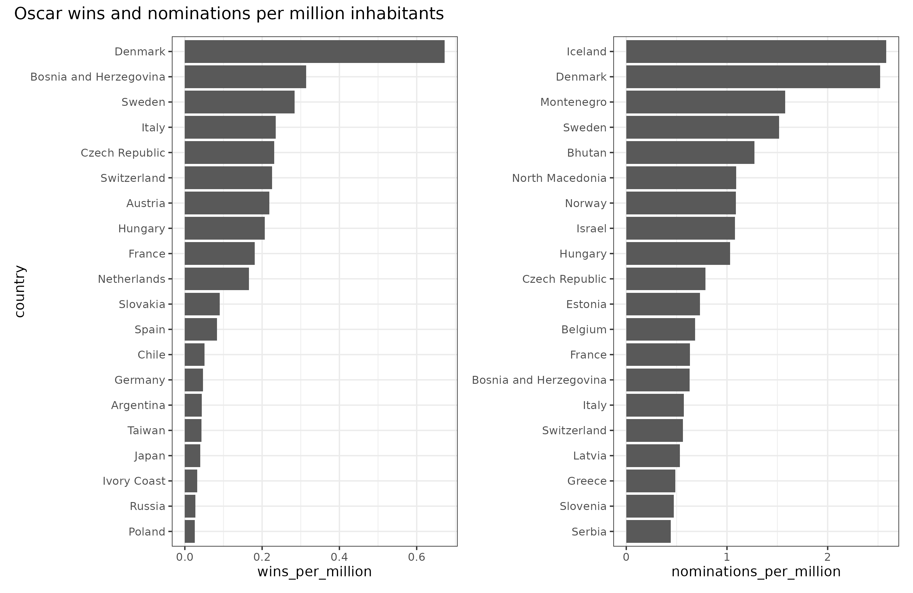Take France as a case study. It got 42 nominations with a population of 66M. This population size means we expected it to get 3.2 nominations, thus, it got 38.8 nominations more than expected. In per capita terms, 0.058 extra nominations per million inhabitants. Denmark got 15 nominations with a population of 6M, which gave it an expectation of 0.3 nominations, so an excess of 14.7, or 2.47 per million inhabitants. While this final metric is intuitive, it is really just the familiar nominations per million restated, as Iceland comes out ahead in exactly the same way (1 nomination, 0.02 expected, 0.98 more than expected, 2.53 per million inhabitants).