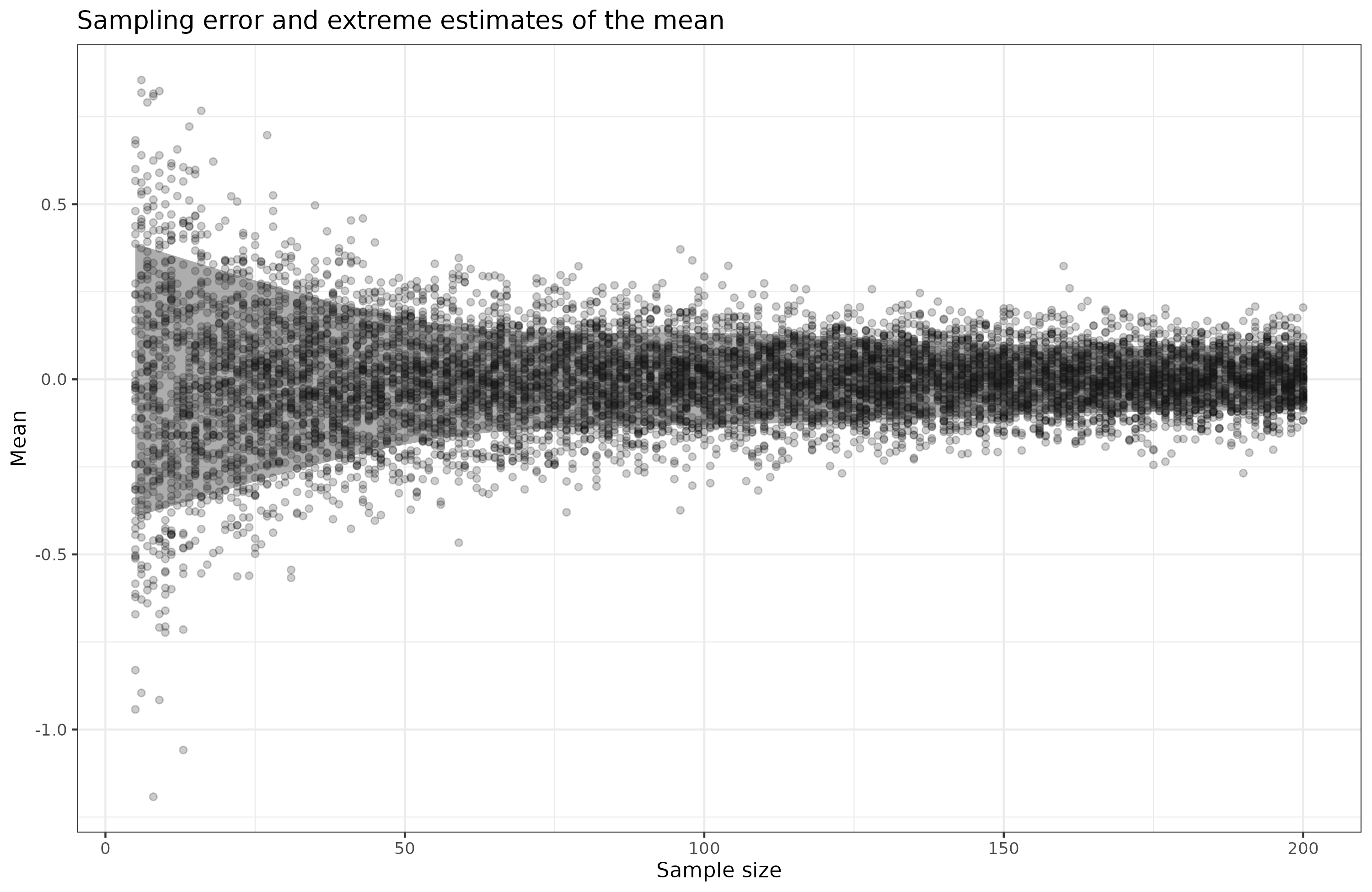 The shaded area show the 10th and 90th quantiles. The true mean for all of these samples is just 0 (SD = 1), and there’s a lot more variation in the smaller sample sizes. Thus, any list of the lowest or highest means will be dominated by small samples (top left). The case for countries and prizes is even worse because they are so rare.