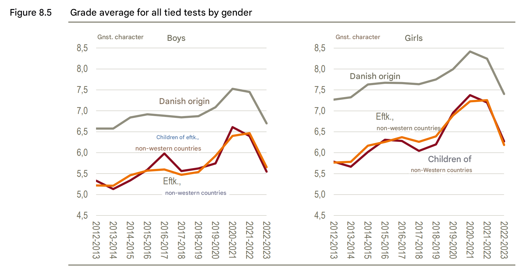 In the compulsory tests at the primary school leaving examination in 2023, the average grade for children of descendants from non-Western countries is 5.5 for boys and 6.3 for girls. The corresponding averages for boys and girls of Danish origin are 6.7 and 7.4.