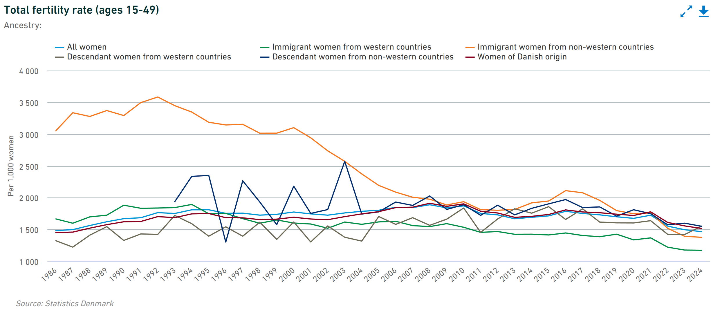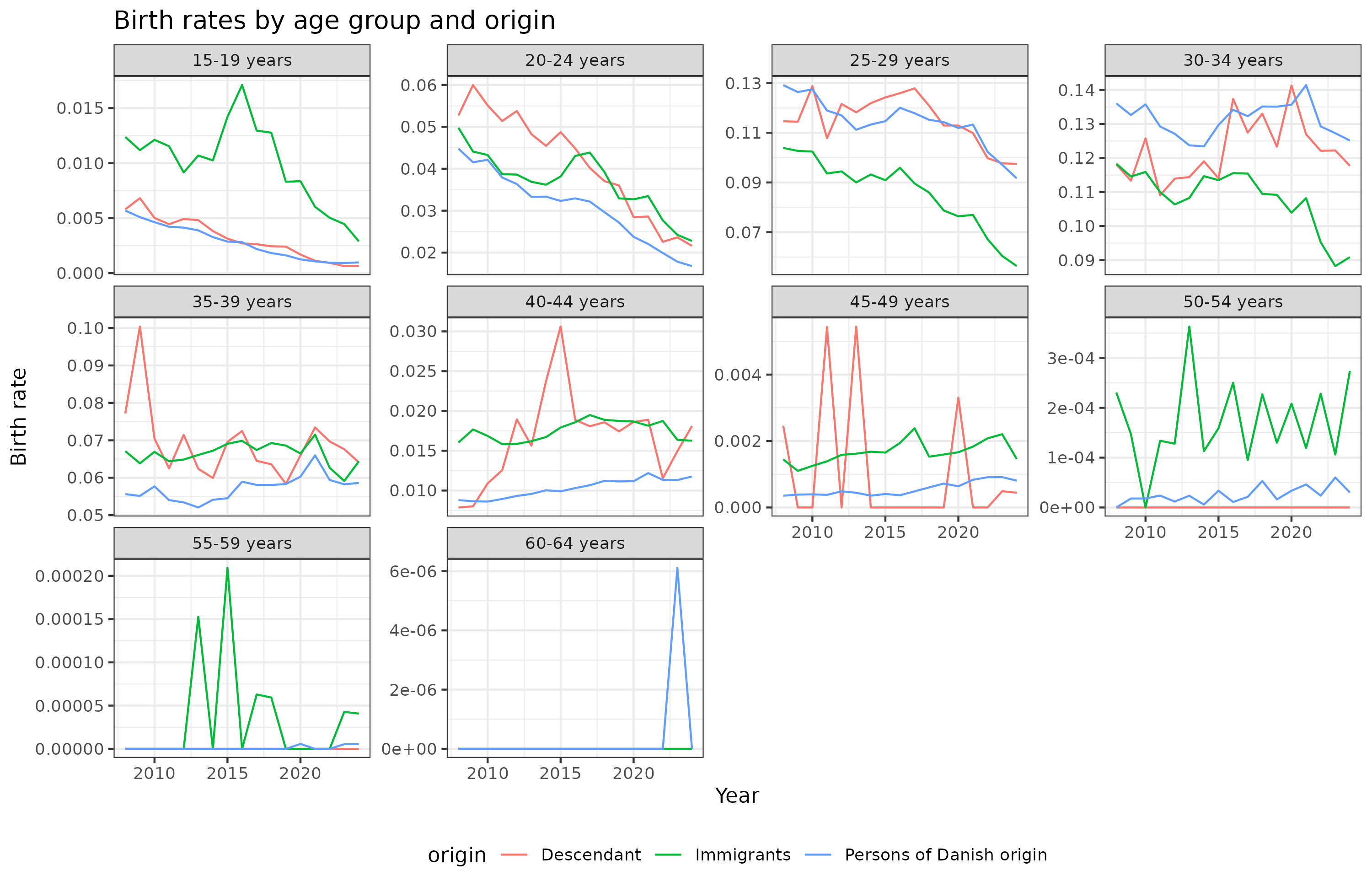 These data concern all persons in Denmark, and there doesn’t seem to be any cohort fertility rates by origin, so we will have to look at age-specific birth rates: