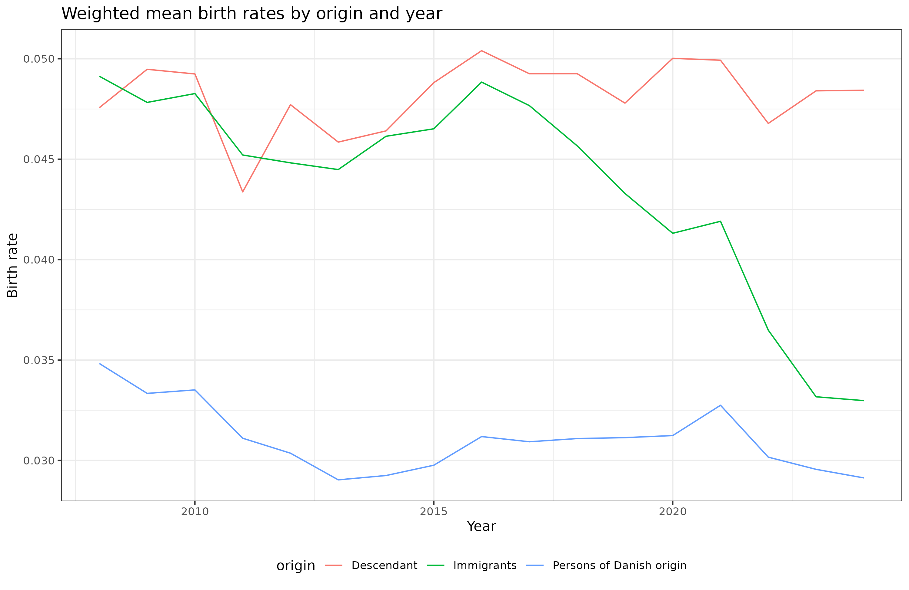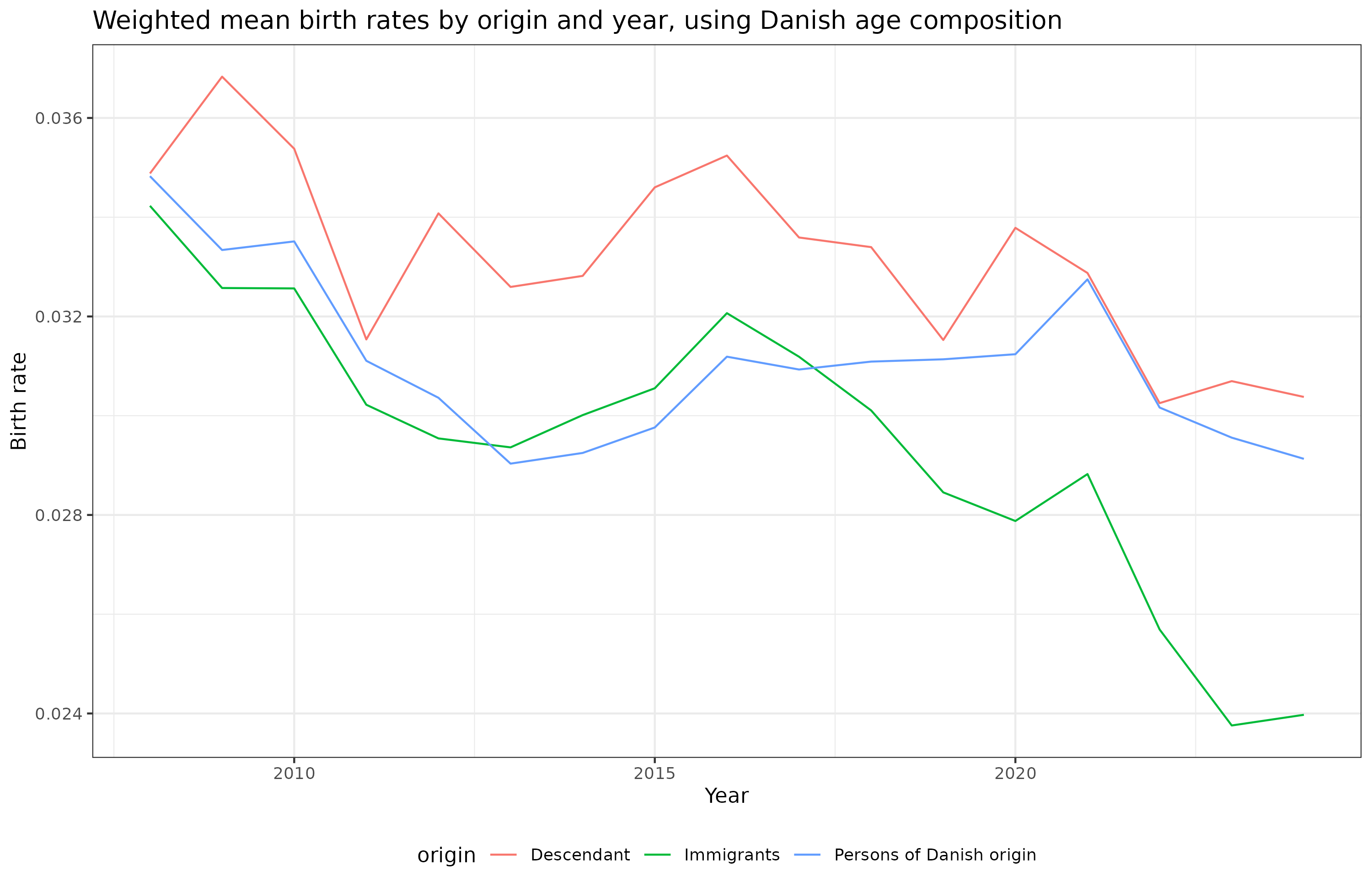 Edited to add: After sleeping on this, it occurred to me that we can remove the age distribution confound by using the Danish population’s age composition to compute the weighted mean for all groups in a given year. This answers the question: what would be the weighted mean birth rate of origin groups be at that year given they all had the Danish age composition (very close to the long term equilibrium given no immigration or emigration). Doing this gives this plot: