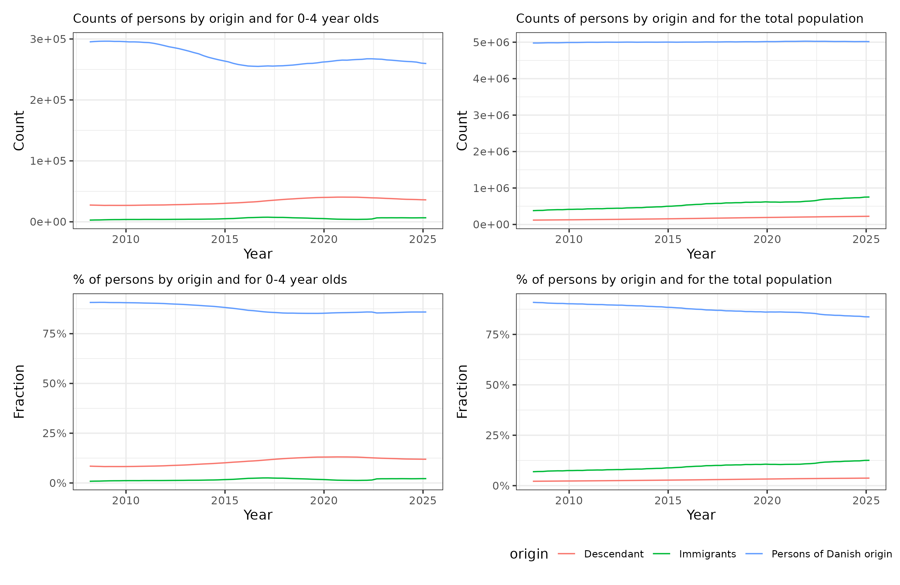 These data are not consistent with the results we got simply from counting persons aged 0-4. I think the reason why is that 3rd generations are usually counted as Danish origin, and though they are relatively small in number, they grow year by year. Danish Statistics notes in their annual report (2024):