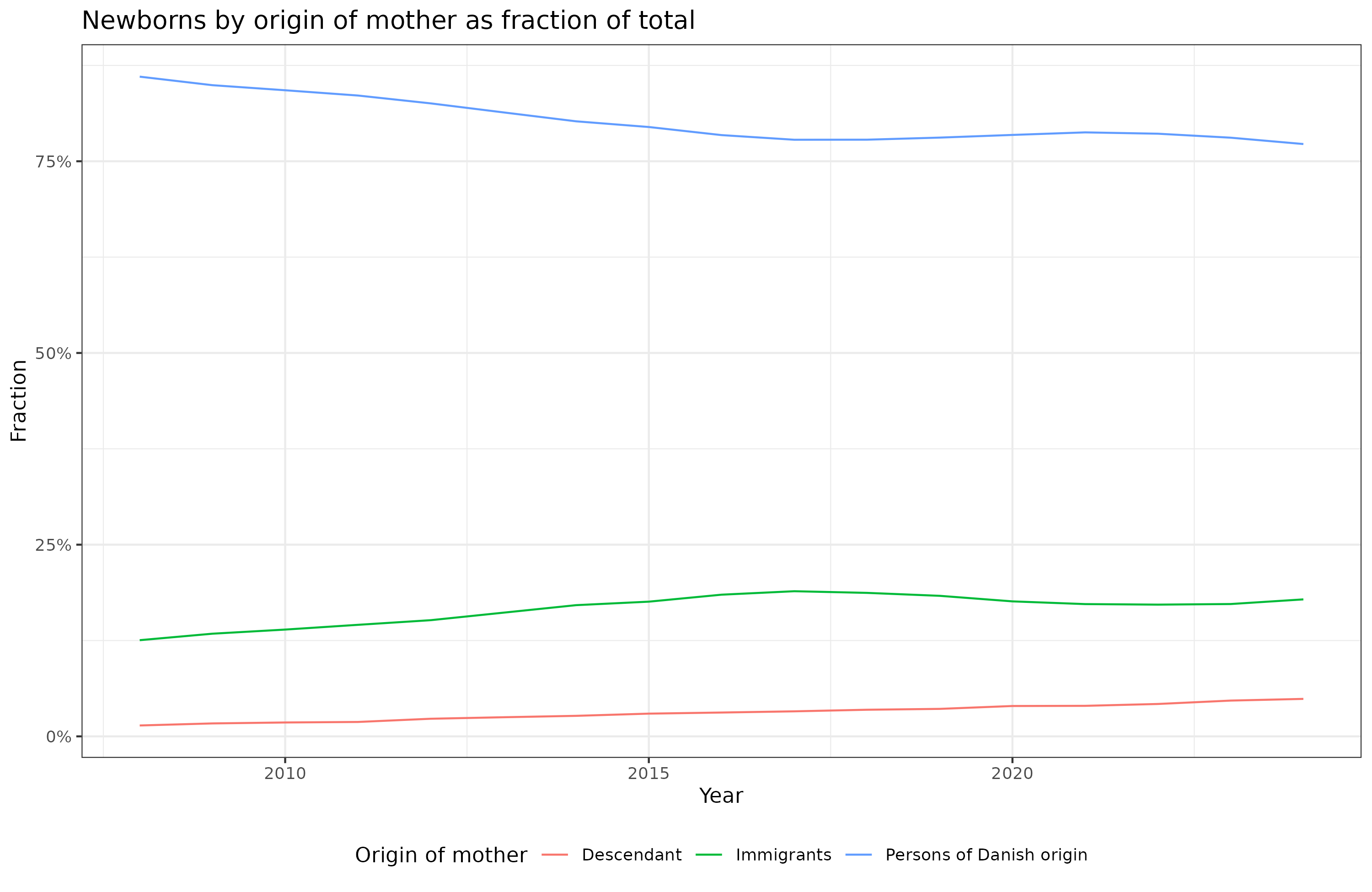 - By using the origin of the mother of newborns, we can more consistently count the Danish % of the young cohort, and this shows a gradual decline, though it is relatively stable since 2016.