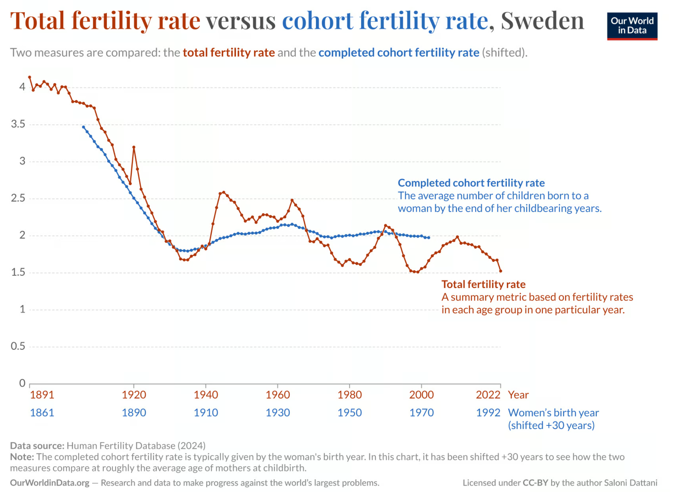 These model forecasts, however, are known to be faulty when age-specific birth rates change. We know they have been changing, women have children later now. OWID has a great page on this: