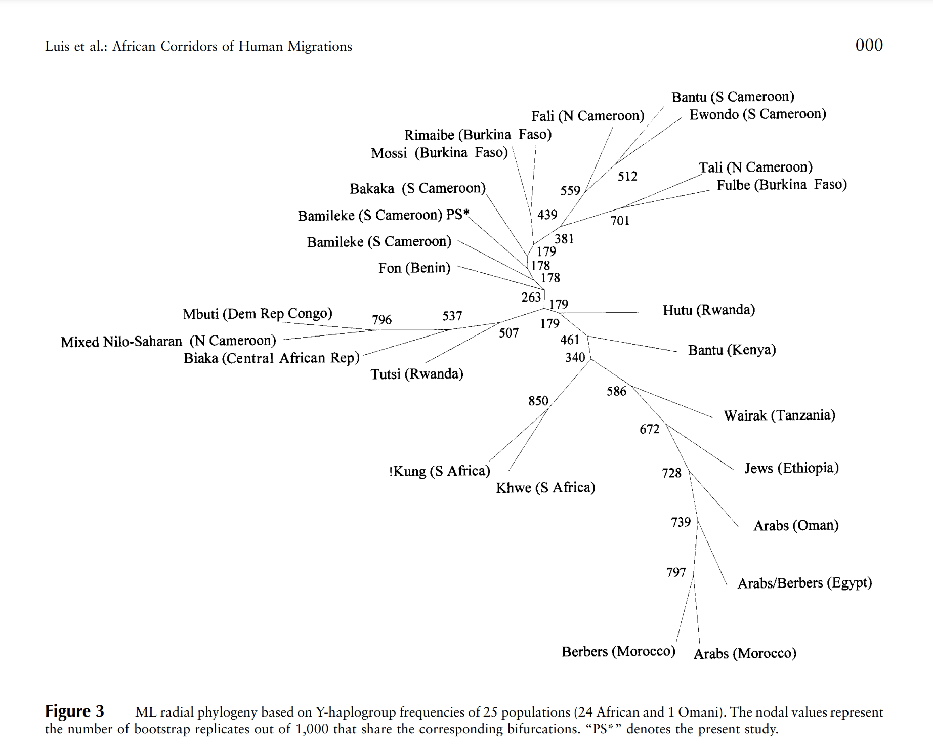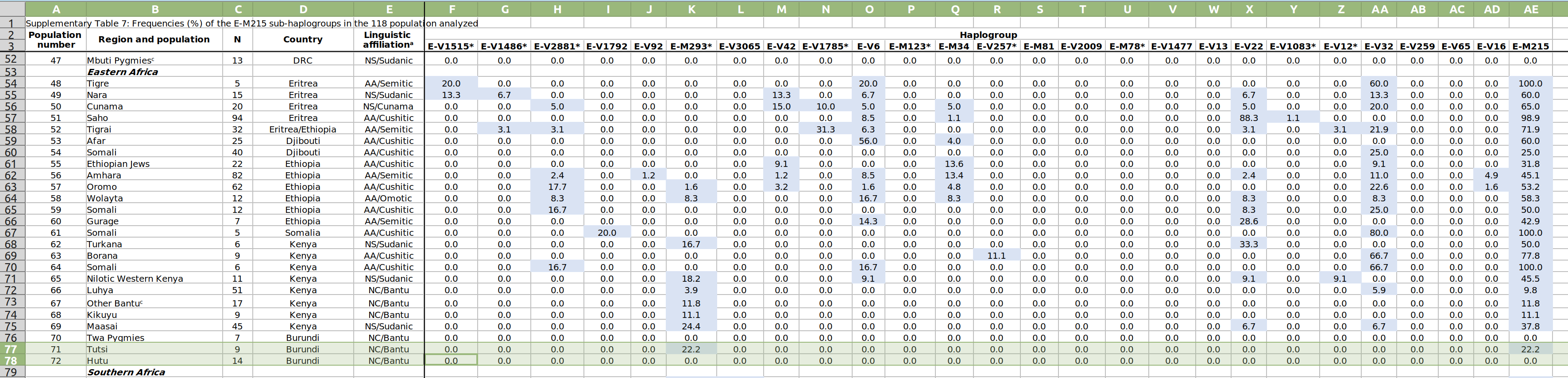 They didn’t include all haplogroups in their table (rows don’t sum to 100), but 22.2% (so 2/9) of the Tutsis had E-M293*, while 0 of the 14 Hutus did. As far as I can tell, this produces a p value of 0.4 (Chi Sq.), which is thus inconclusive given the sample sizes. Tischkoff 2009 also had data from Tutsi and Hutu, but only 6 people and they are not labelled separately in their public dataset (sad!). However, there is a final paper by Luis et al 2004, which has better data: 69 Hutus and 94 Tutsis. They computed fractions of some haplogroups: