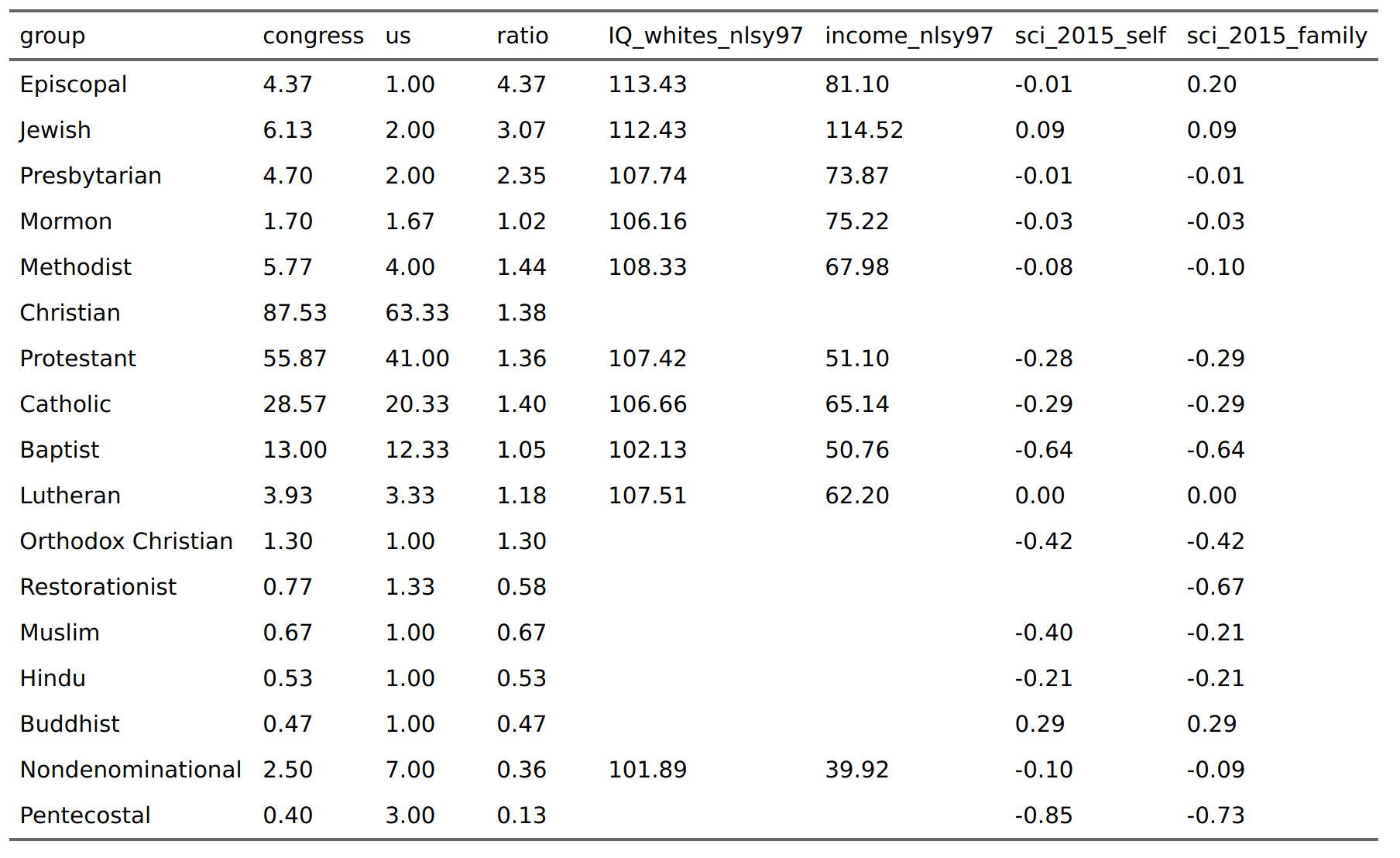 I compiled the congress data from Pew from 117th, 118th, and 119th congress to stabilize the numbers slightly (didn’t help much because people rarely change). I also threw in a replication based on another Pew research survey that measured intelligence in the form of science knowledge. Grouping the 1000+ Christian variaties into the Pew religious categories in the congress table was done by regex best of my (quick) ability. Then we get this table: