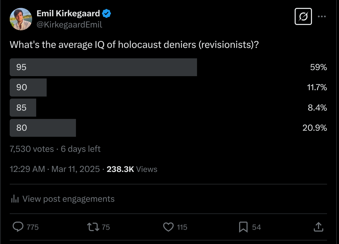 100s of those people showed up in the replies to insult me or provide stupid arguments for why it is wrong (almost all of them are in the form of “what about smart person X who was an anti-Semite”). That was of course the intention. Their response to the poll demonstrated that the value could not be above 100.