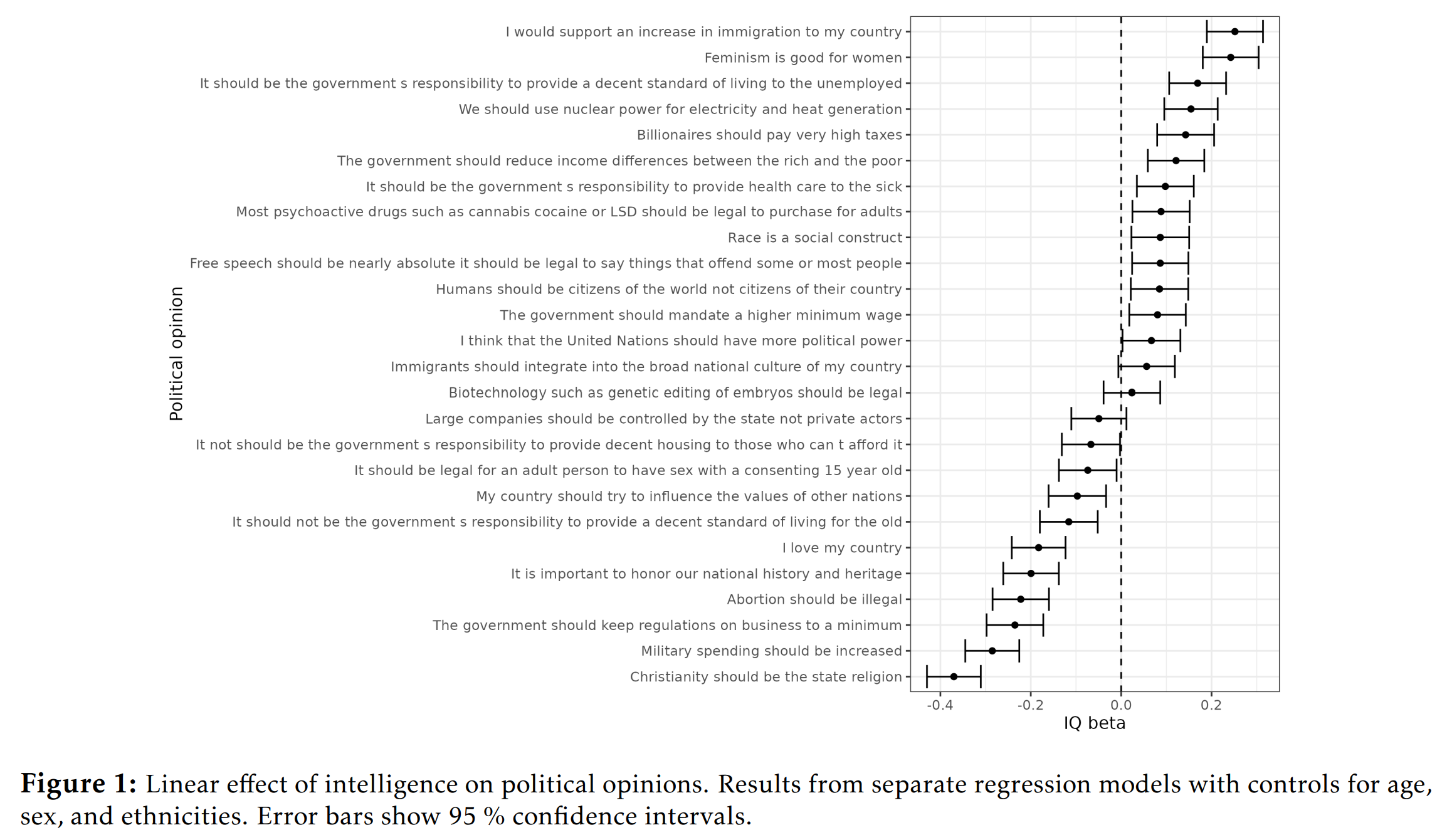 After adjustments for age, sex, and ethnicity, there are some fairly typical positive associations between vocabulary score and more left-wing beliefs. For instance, beta = 0.24 for pro-more-immigration, beta = -0.22 for less regulation. Looking around, there are only a few beliefs that break this pattern, such as the positive beta of 0.16 for pro-nuclear power.
