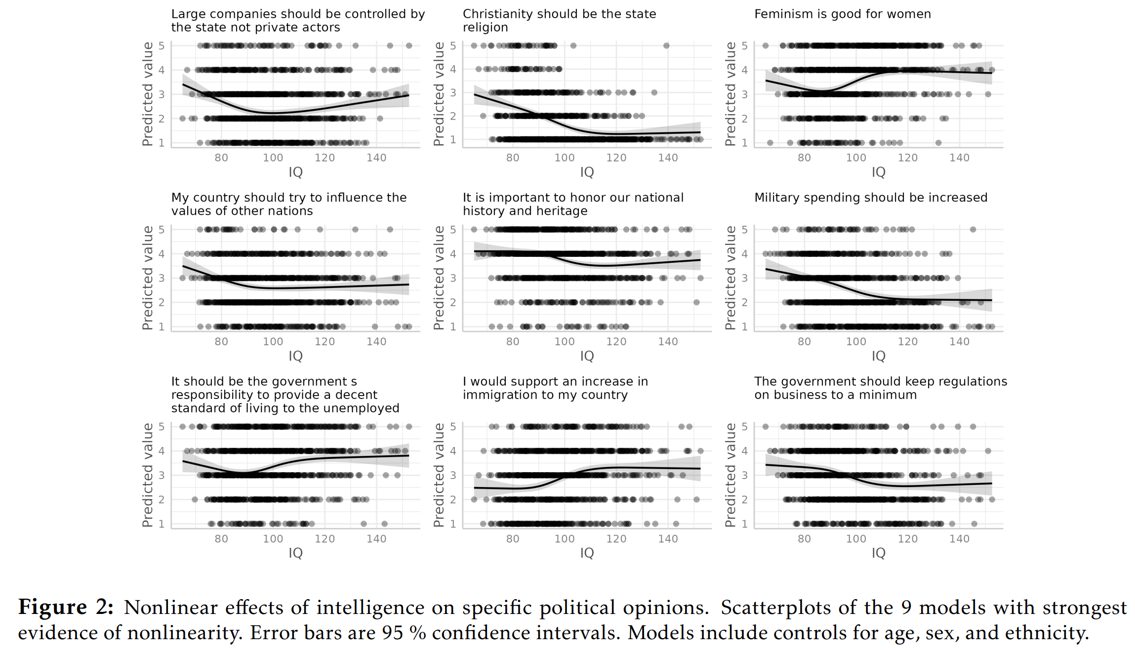Of the 26 beliefs, 15 of the 26 (58 %) models showed evidence (p < .05) of nonlinear effects. Given chance only, this value is expected to be 5% (1.3 beliefs out of 26). Using strict multiple testing correction (Bonferroni), 5 of the 26 beliefs had nonlinear patterns (p < .05/26). The most nonlinear ones are shown in the plot above. Amusingly, we get a midwit pattern for governments running large businesses, with both the low and high intelligence people being in favor of this (oh dear). For others, we get flat patterns, such as whether feminism is good for women, which shows a flat association after 110 IQ.