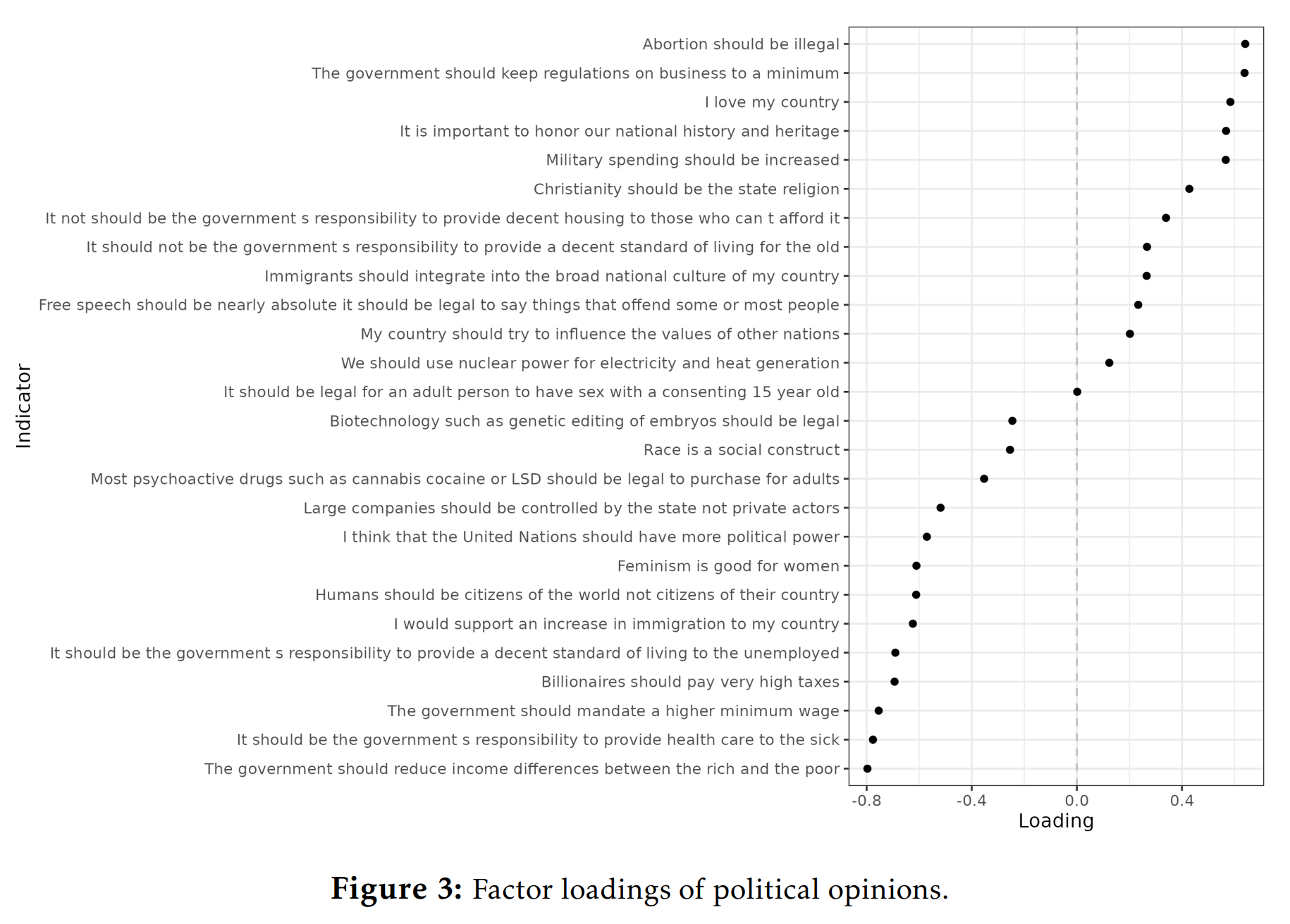 It may be more interesting to look at the overall pattern, and for this, we need to create an overall conservatism (rightism) score. The factor loadings are as follows: