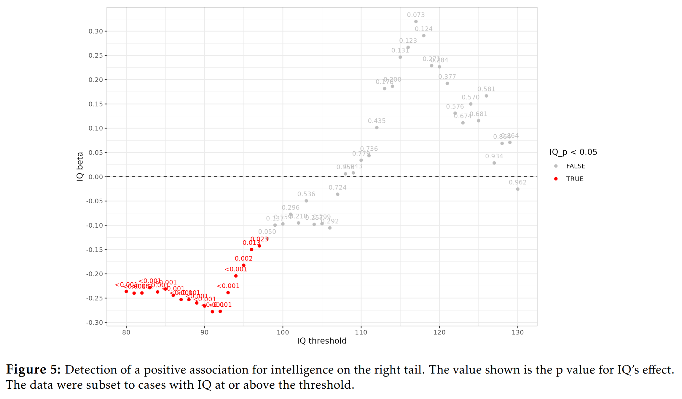 The X axis value is the threshold used for inclusion. Thus, if we include almost the entire sample (80+ threshold), the linear beta is quite negative (-0.23, Y axis value). However, after thresholds of about 92 IQ, the beta gets progressively more positive. If we use only the cases with IQ 117+, then the beta becomes 0.35! The p-value for this trend is 0.073 (numbers shown on points) which is not impressive, but nevertheless, is suggestive considering this was a directional test (meaning the p-value should be halved).