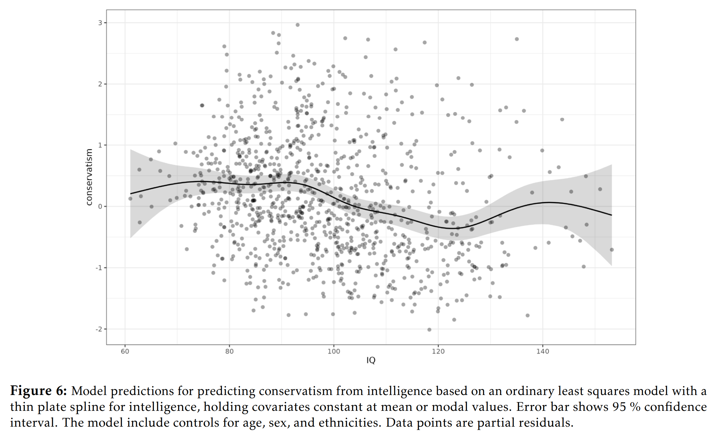 The main association is negative, beta = -0.22, but it is nonlinear. The negative value comes from the decline in conservatism starting around 95 IQ but ending around 120 IQ. The overall nonlinear pattern is far beyond chance (p’s 0.0012 and 0.0008, depending on how many splines are specified). However, just because a nonlinearity is detected does not mean it is detected in the right tail. As far as I know, there is no analytic statistical test for the monotonicness of a spline function.